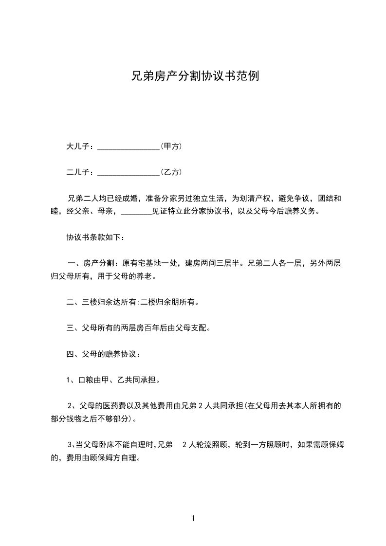 五、本协议共1页一式三份,父和母、甲、乙各执一份,一经签字按手印,兄弟双方对以上协议均不得反悔。未尽事宜兄弟二人协商解决。