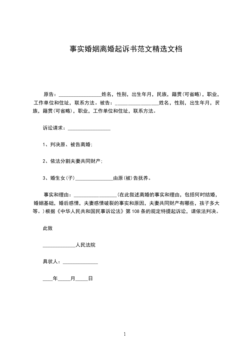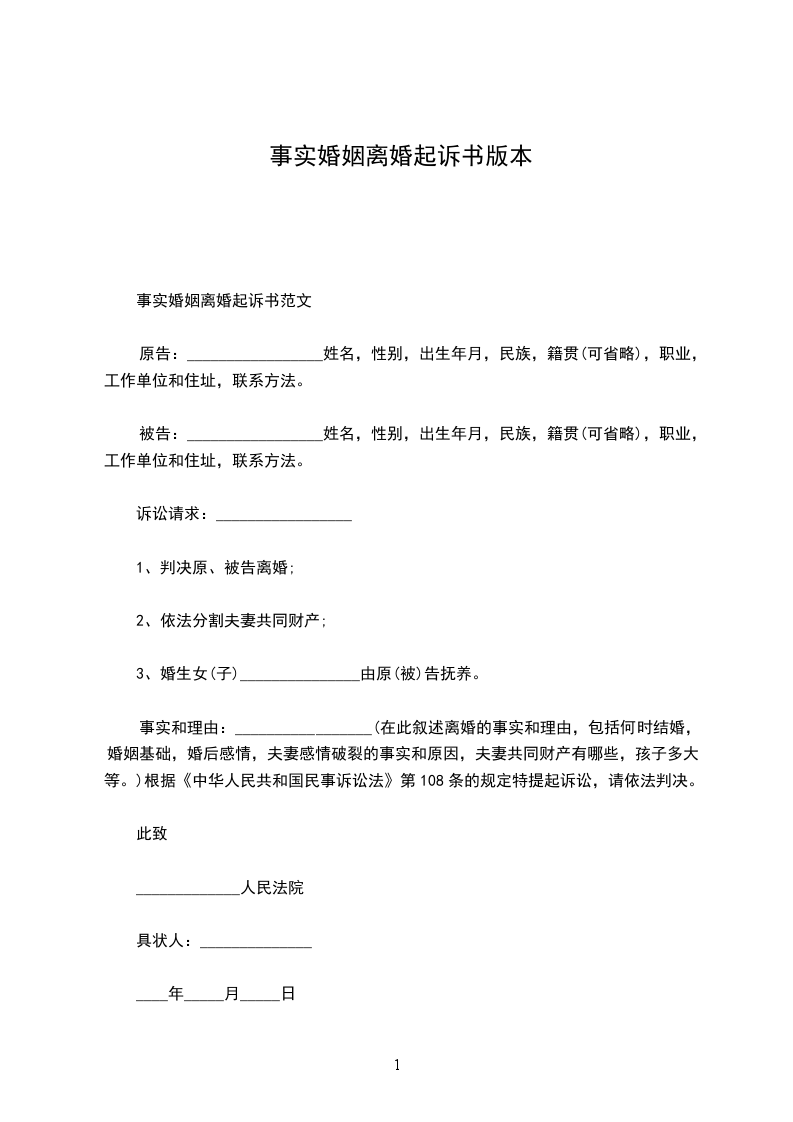 事实和理由:_________________(在此叙述离婚的事实和理由,包括何时结婚,婚姻基础,婚后感情,夫妻感情破裂的事实和原因,夫妻共同财产有哪些,孩子多大等。)根据《中华人民共和国民事诉讼法》第108条的规定特提起诉讼,请依法判决。