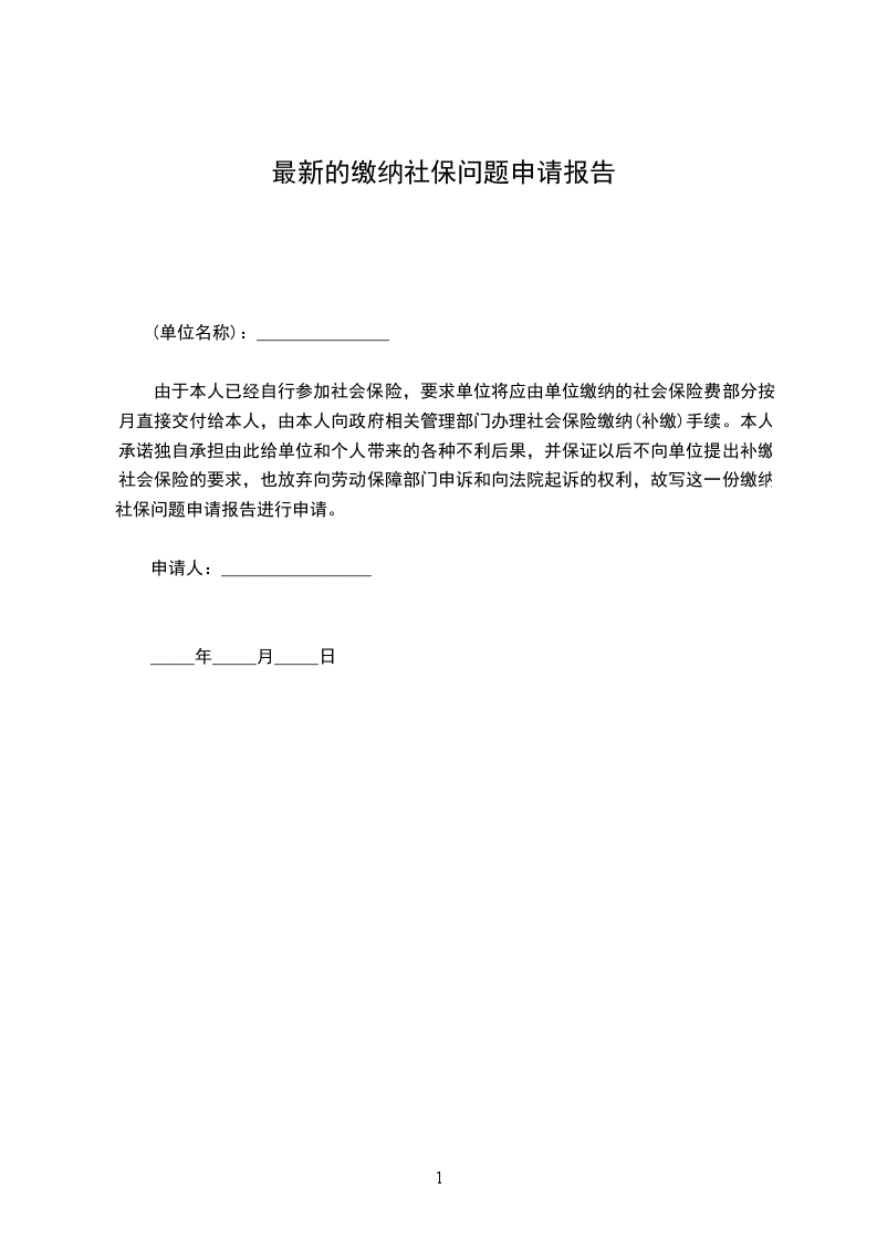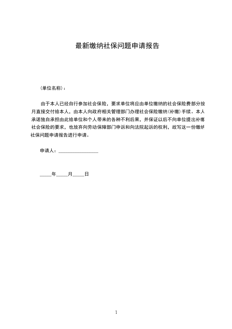 由于本人已经自行参加社会保险,要求单位将应由单位缴纳的社会保险费部分按月直接交付给本人,由本人向政府相关管理部门办理社会保险缴纳(补缴)手续。本人承诺独自承担由此给单位和个人带来的各种不利后果,并保证以后不向单位提出补缴社会保险的要求,也放弃向劳动保障部门申诉和向法院起诉的权利,故写这一份缴纳社保问题申请报告进行申请。