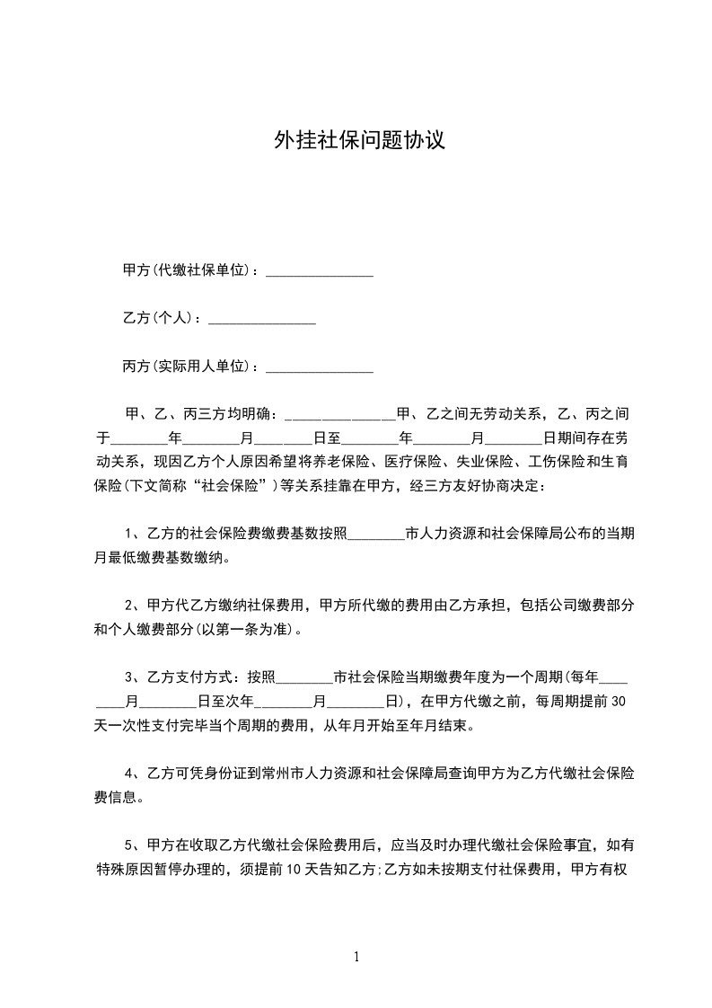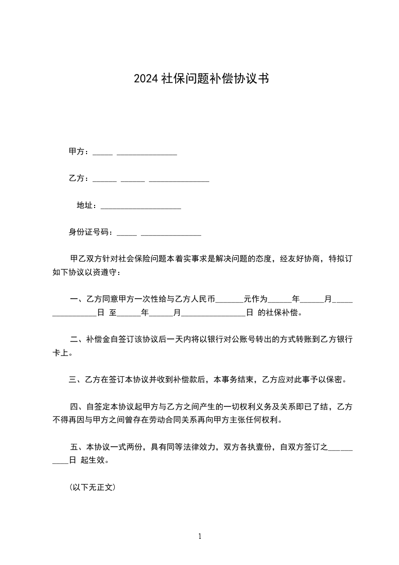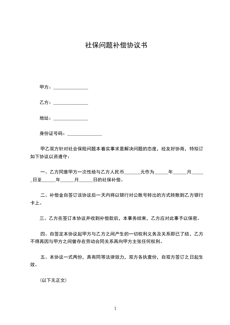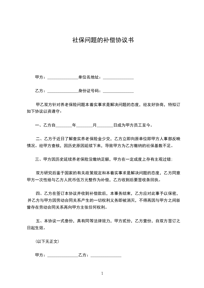 一、乙方同意甲方一次性给与乙方人民币_______元作为______年______月______日至______年______月______日的社保补偿。