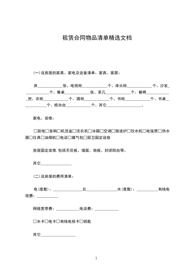 □彩电□音响□机顶盒□洗衣机□冰箱□空调□微波炉□饮水机□电饭煲□热水器□灶具□油烟机□电话□煤气包□厨卫固定设施