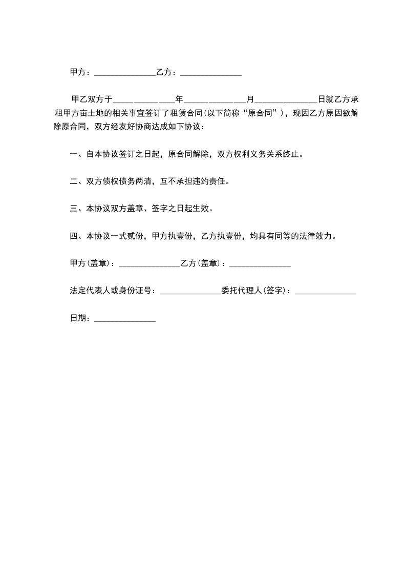 甲乙双方于_______________年_______________月_______________日就乙方承租甲方亩土地的相关事宜签订了租赁合同(以下简称“原合同”),现因乙方原因欲解除原合同,双方经友好协商达成如下协议: