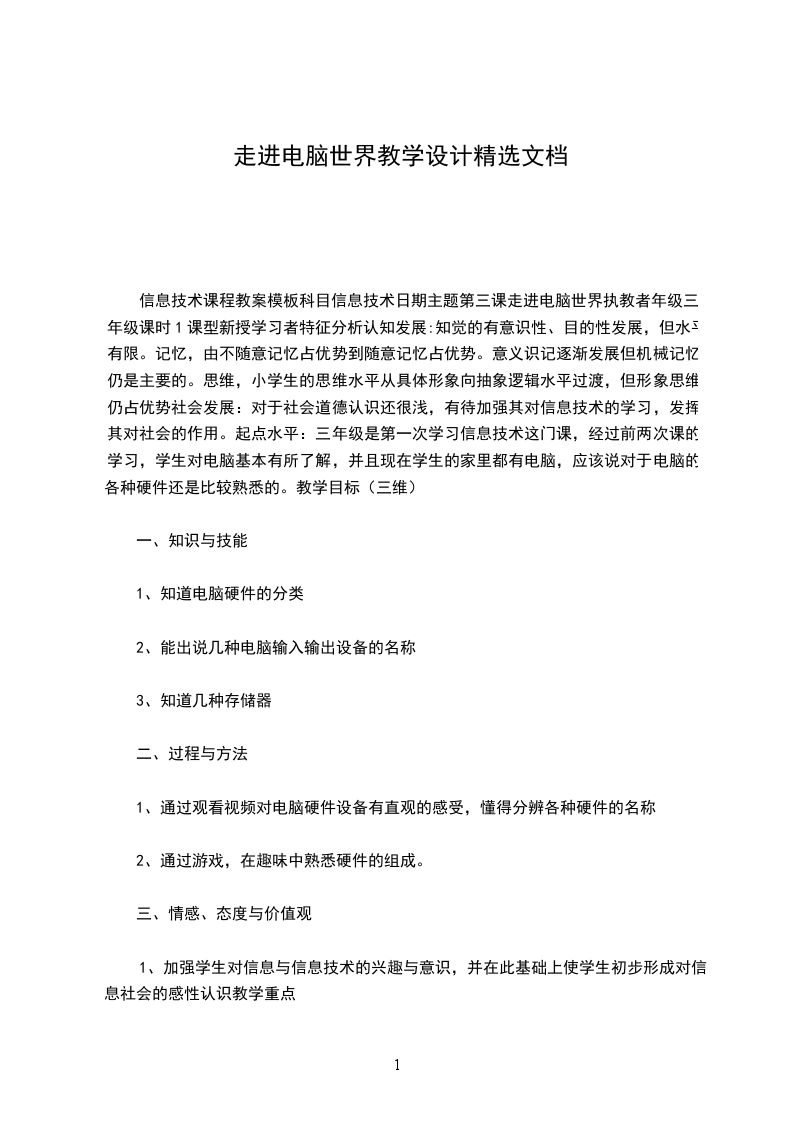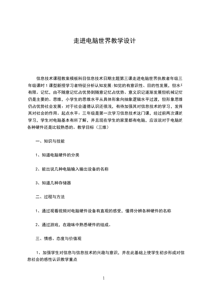 信息技术课程教案模板科目信息技术日期主题第三课走进电脑世界执教者年级三年级课时1课型新授学习者特征分析认知发展:知觉的有意识性、目的性发展,但水平有限。记忆,由不随意记忆占优势到随意记忆占优势。意义识记逐渐发展但机械记忆仍是主要的。思维,小学生的思维水平从具体形象向抽象逻辑水平过渡,但形象思维仍占优势社会发展:对于社会道德认识还很浅,有待加强其对信息技术的学习,发挥其对社会的作用。起点水平:三年级是第一次学习信息技术这门课,经过前两次课的学习,学生对电脑基本有所了解,并且现在学生的家里都有电脑,应该说对于电脑的各种硬件还是比较熟悉的。教学目标(三维)