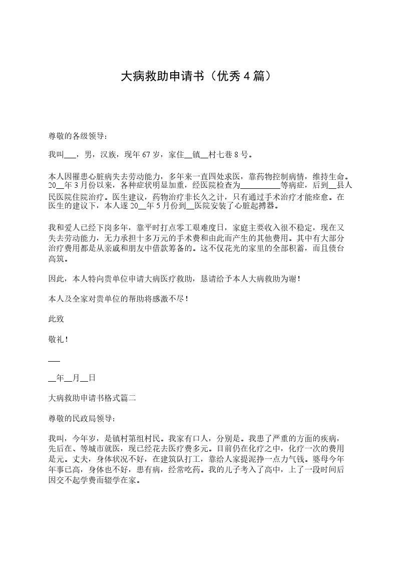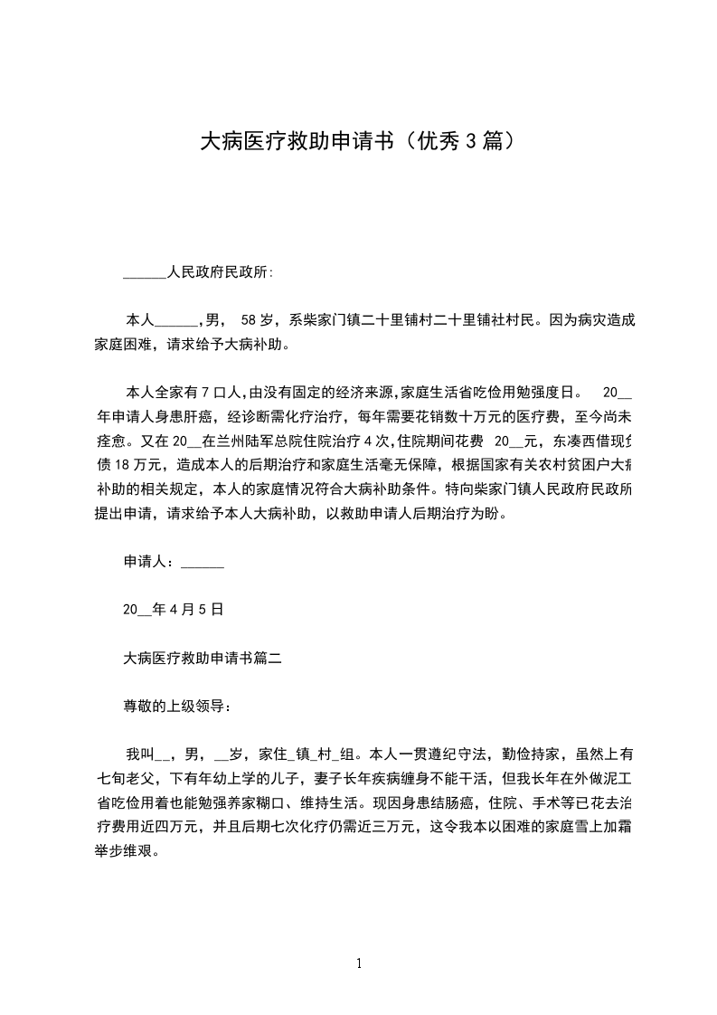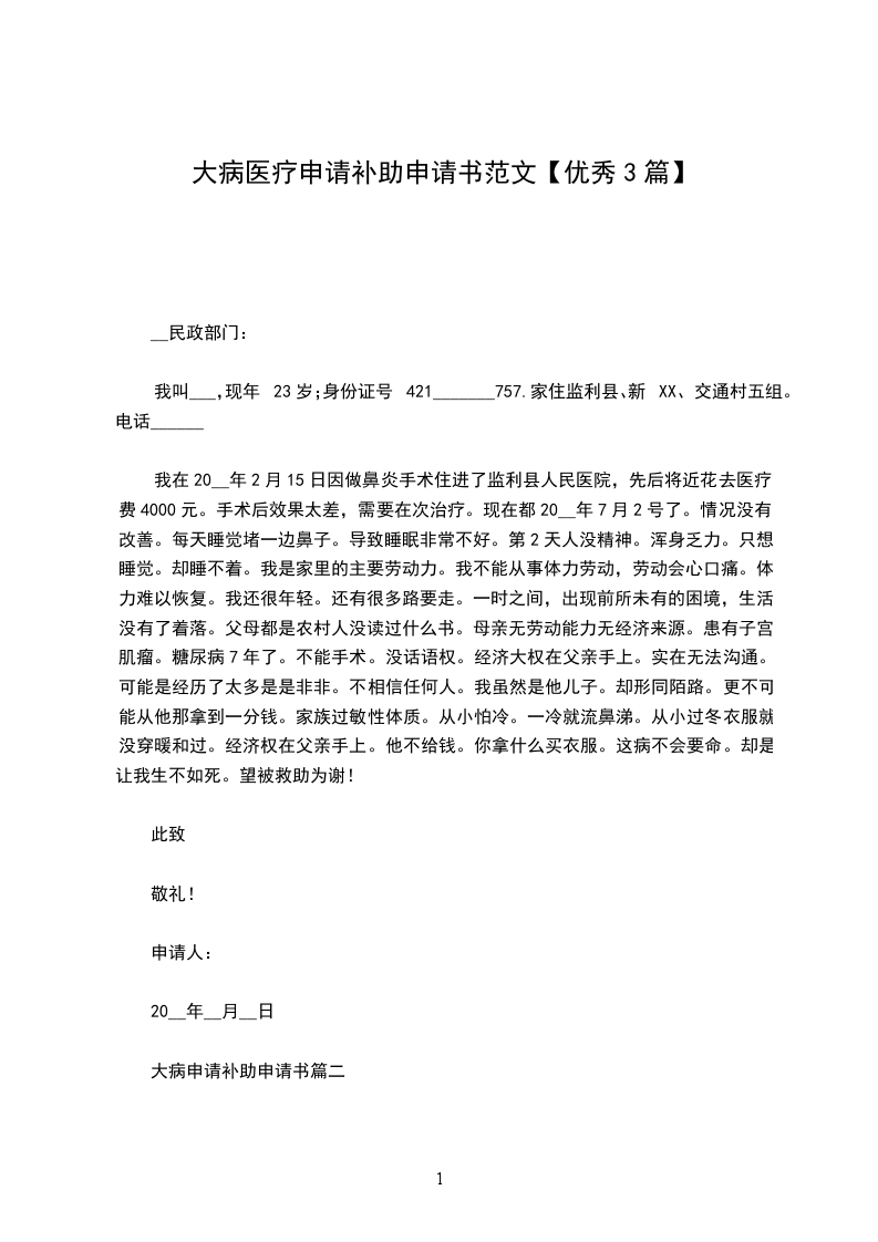 大病补助申请书篇三