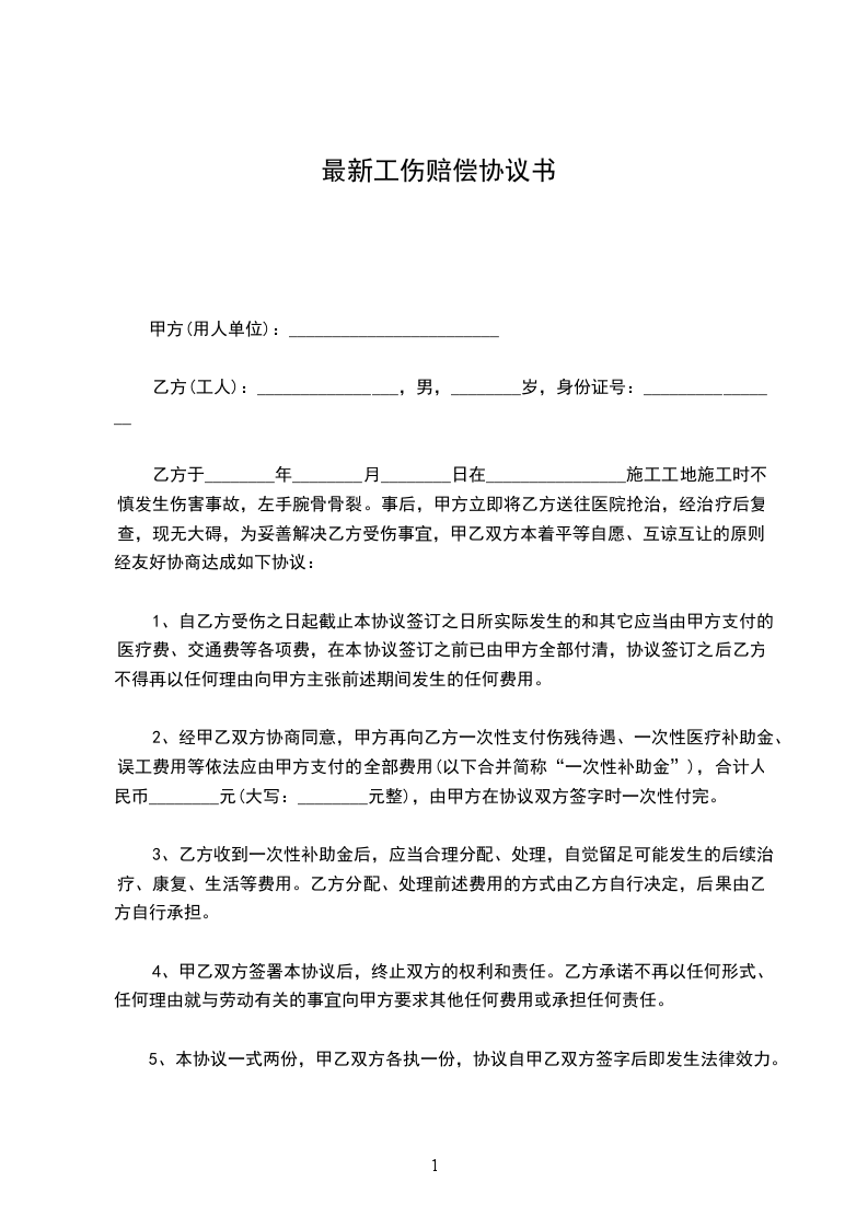 一、由甲方一次性赔偿乙方后续医疗费、工伤伤残补助金、一次性医疗和就业补助业、工伤期间工资、护理费、伙食费、交通费、经济补偿等各项费用共计_______________元整(小写);