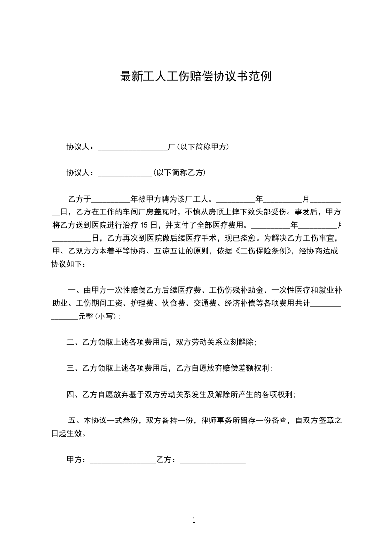 乙方于__________年被甲方聘为该厂工人。________年________月________日,乙方在工作的车间厂房盖瓦时,不慎从房顶上摔下致头部受伤。事发后,甲方将乙方送到医院进行治疗15日,并支付了全部医疗费用。_________年________月________日,乙方再次到医院做后续医疗手术,现已痊愈。为解决乙方工伤事宜,甲、乙双方方本着平等协商、互谅互让的原则,依据《工伤保险条例》,经协商达成协议如下: