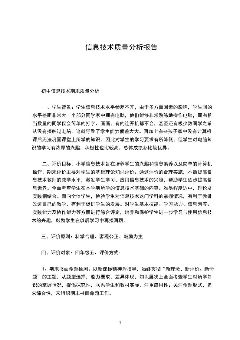 二、评价目标:小学信息技术旨在培养学生的兴趣和信息素养以及简单的计算机操作,期末评价主要对学生的基础理论知识评价。通过评价的合理实施,不断提高信息技术教师的教学水平,激发学生学习、应用信息技术的兴趣,帮助学生逐步提高信息素养。全面考查学生在本学期所学的信息技术基础的内容。难易程度适中,理论及实践相结合。面向全体学生,检验学生对信息技术这门学科的掌握情况,有利于教师改进自己的教学,有利于促进学生的发展。对学生基本技能、学习能力、信息素养、实践能力及协作能力等方面进行综合评定,培养和保护学生进一步学习与使用信息技术的兴趣,鼓励学生在以后学习中再接再厉。