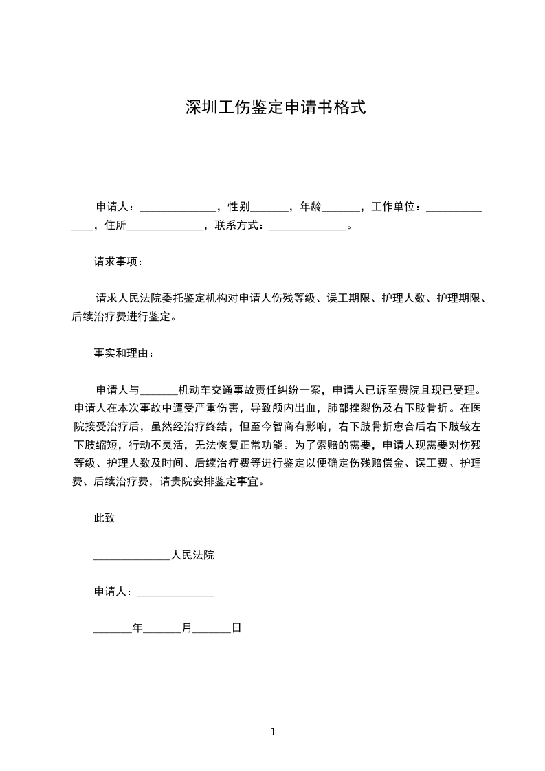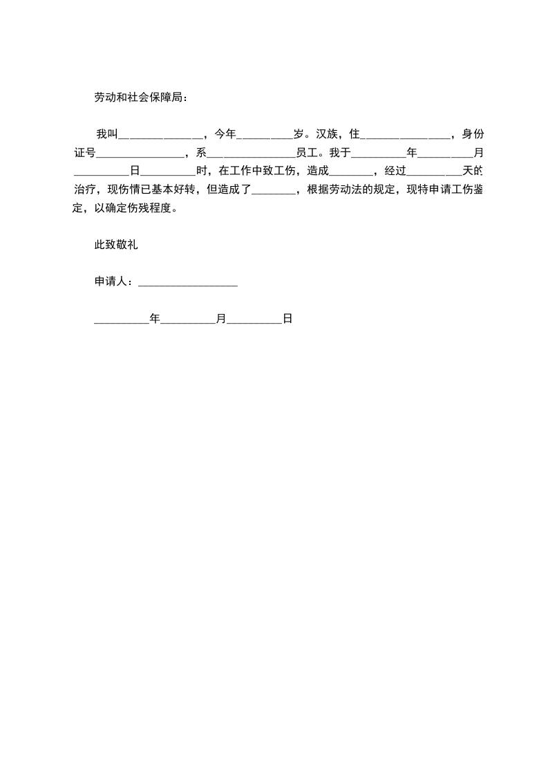 我于__________年__________月__________日__________时,在工作中致工伤,造成........,经过__________天的治疗,现伤情已基本好转,但造成了.......,根据劳动法的规定,现特申请工伤鉴定,以确定伤残程度。