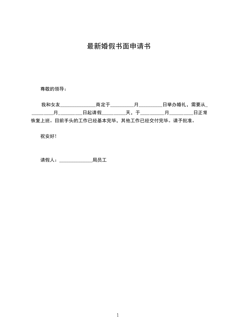 我和女友_______________商定于__________月__________日举办婚礼,需要从__________月__________日起请假__________天,于__________月__________日正常恢复上班。目前手头的工作已经基本完毕,其他工作已经交付完毕。请予批准。