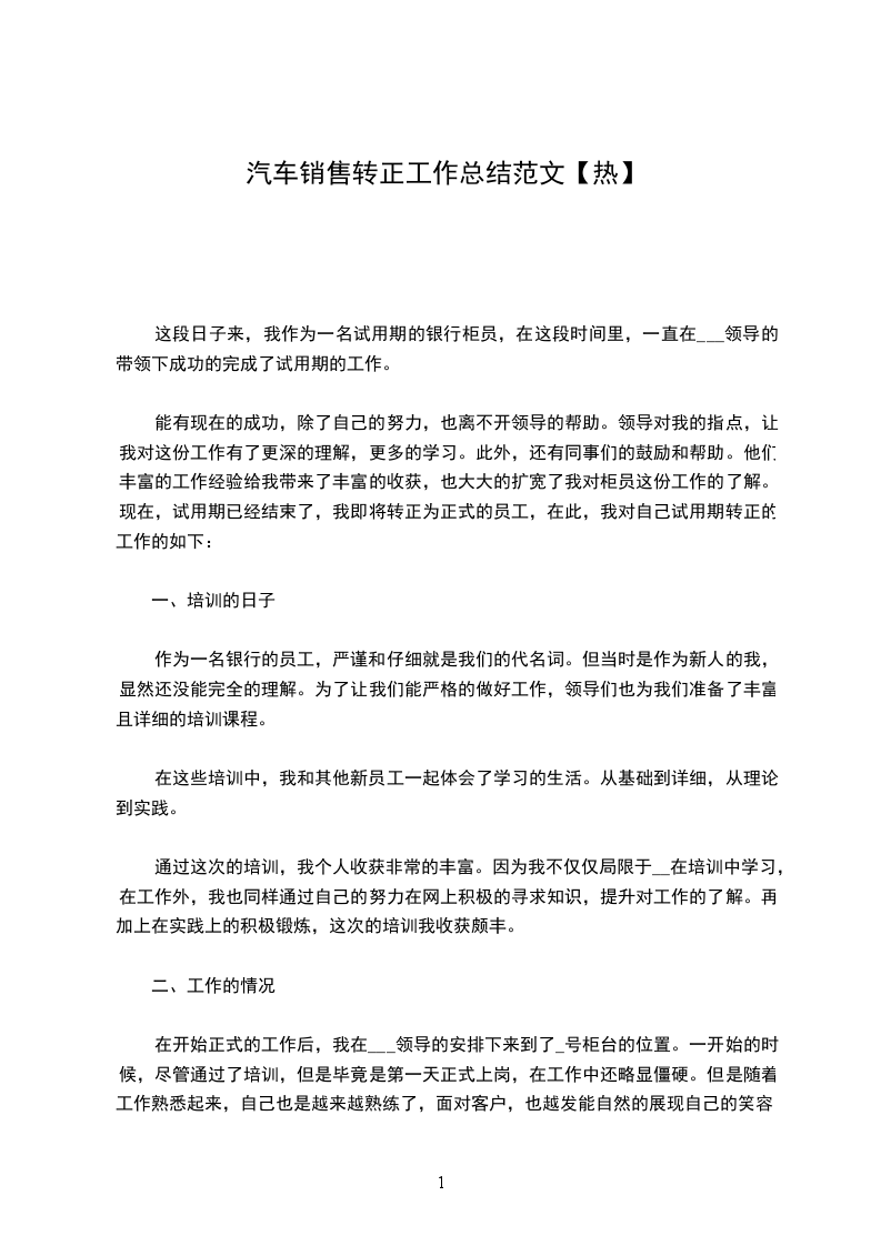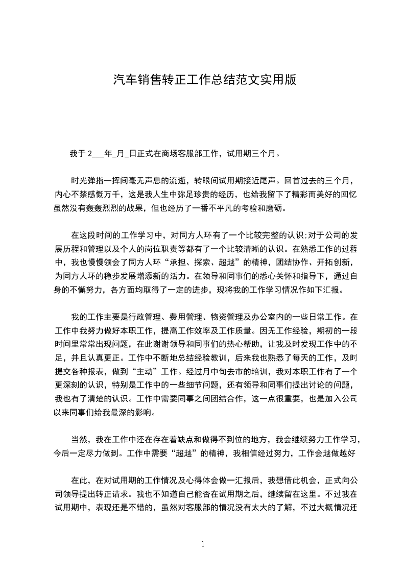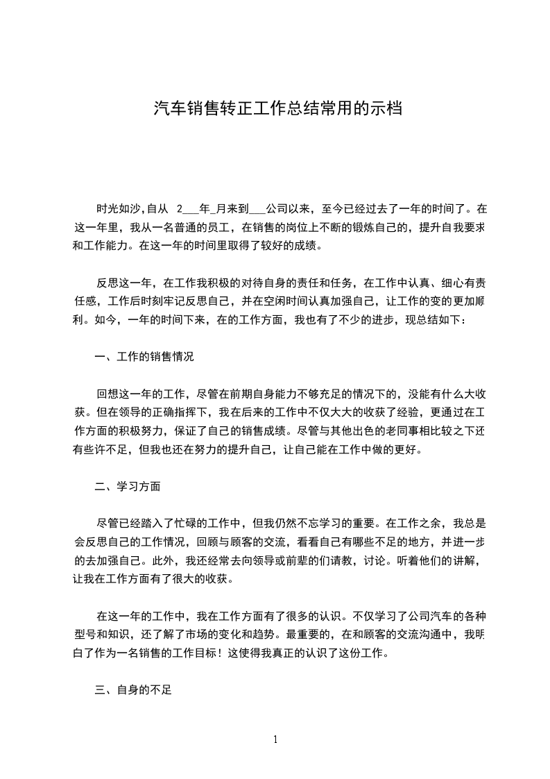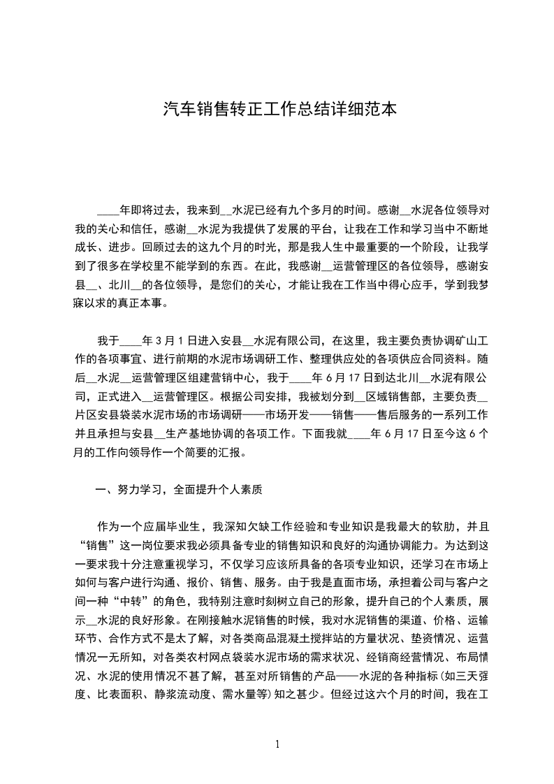 20xx年3月1日我成为公司的试用员工,到今天三个月试用期已满,在岗试用期间,我在销售部学习工作。汽车销售是我以前未曾接触过的,在销售部领导的耐心指导和同事热心帮助下,我很快熟悉了汽车销售的规范操作流程。其中我掌握了各车型的报价组成,汽车销售的流程、了解汽车行业相应的政策、法规、制度…在销售部的工作中,我一直严格要求自己,认真做好日常工作;遇到不懂的问题虚心向同事请教学习,不断提高充实自己,希望能尽早独当一面,为公司做出更大的贡献。当然,刚进入销售部门,业务水平和销售经验上难免会有些不足,在此,我要特地感谢销售部的领导和同事对我的入职指引和悉心的帮助,感谢他们对我工作中提醒和指正。