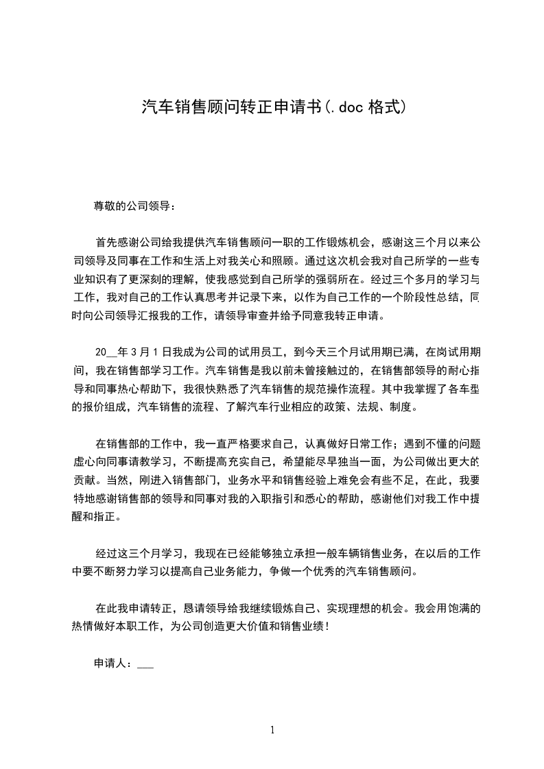 您们好!我20xx年xx月xx日进入公司,目前在xx店担任汽车销售顾问的职位。两个多月以来,我在这个团结求实、温暖友爱的集体里,亲身感受到了组织的关怀和共同奋斗的激动。我也认真按照公司的相关标准和领导的要求去规范自己,努力学习相关知识,在实践中不断进步,希望能尽快成为一名合格的销售顾问。在实习期满之际,我郑重向公司领导提出转正申请。