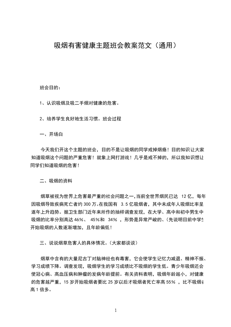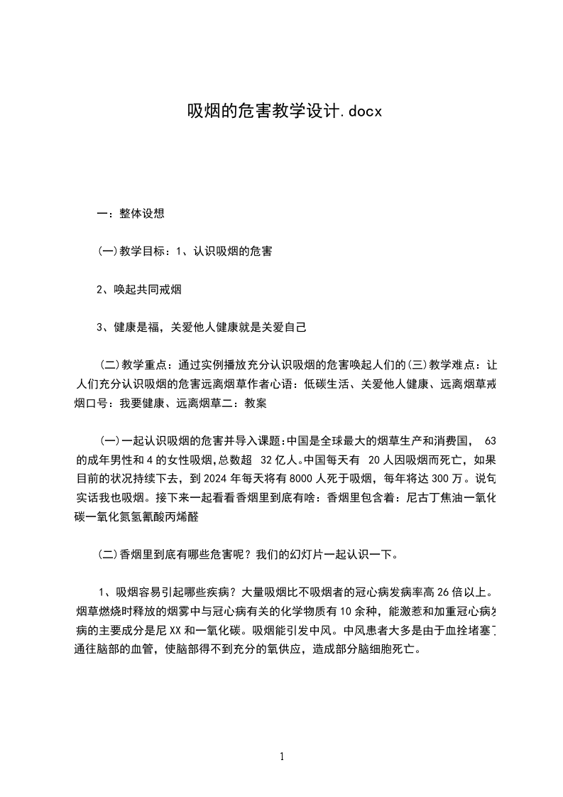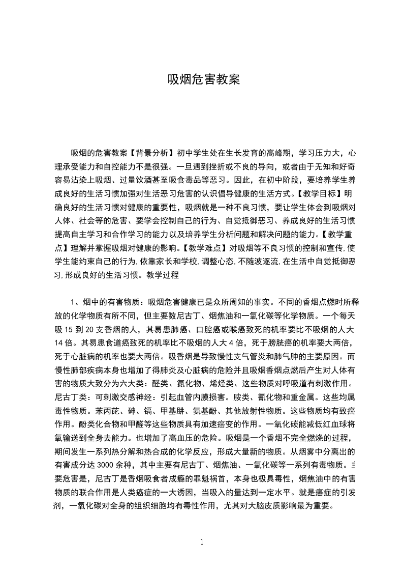 吸烟的危害教案【背景分析】初中学生处在生长发育的高峰期,学习压力大,心理承受能力和自控能力不是很强。一旦遇到挫折或不良的导向,或者由于无知和好奇,容易沾染上吸烟、过量饮酒甚至吸食毒品等恶习。因此,在初中阶段,要培养学生养成良好的生活习惯加强对生活恶习危害的认识倡导健康的生活方式。【教学目标】明确良好的生活习惯对健康的重要性,吸烟就是一种不良习惯,要让学生体会到吸烟对人体、社会等的危害、要学会控制自己的行为、自觉抵御恶习、养成良好的生活习惯、提高自主学习和合作学习的能力以及培养学生分析问题和解决问题的能力。【教学重点】理解并掌握吸烟对健康的影响。【教学难点】对吸烟等不良习惯的控制和宣传,使学生能约束自己的行为,依靠家长和学校,调整心态,不随波逐流,在生活中自觉抵御恶习,形成良好的生活习惯。教学过程
