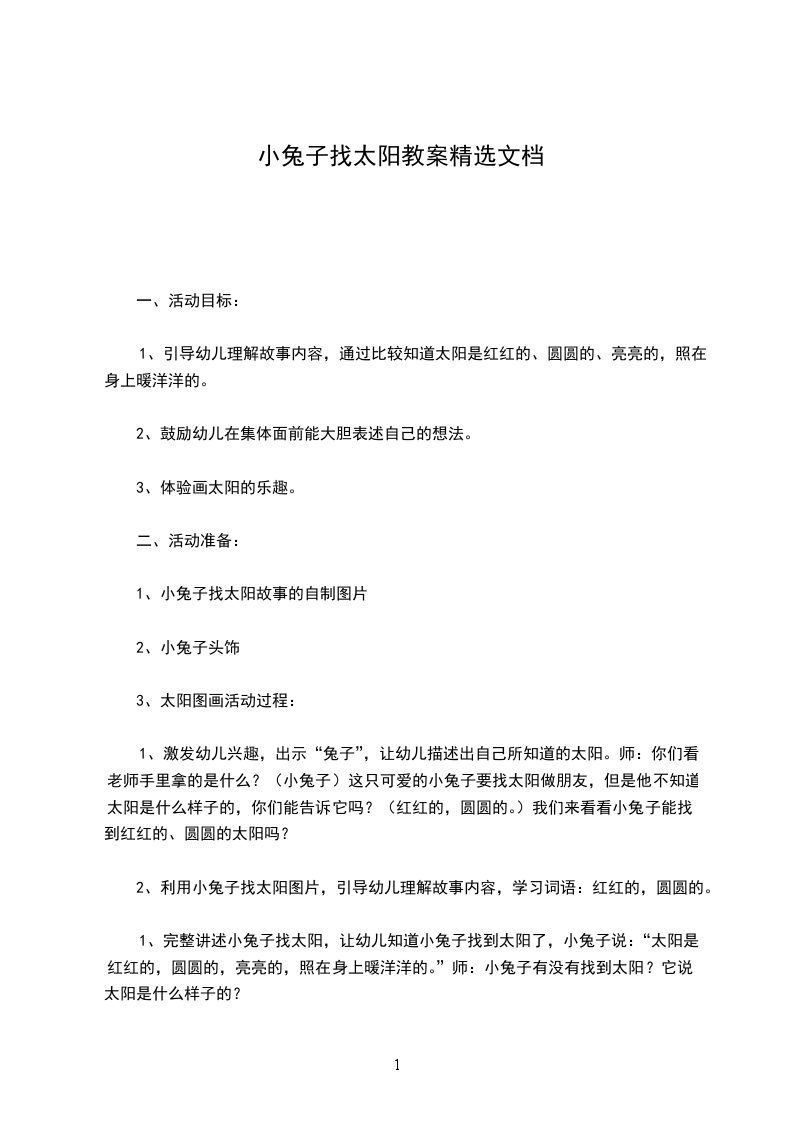 3、结束活动。你们喜欢太阳吗?那我们一起去和太阳做游戏吧!附:小兔子找太阳有一只可爱的小兔子,听说太阳是红红的、圆圆的,便要去找太阳。它来到屋子里,指着两盏红红的、圆圆的灯笼问妈妈:“妈妈,这是太阳吗?”妈妈说:“不,这是两盏红灯笼,太阳在屋子外面呢!”小兔子来到菜园里,看见三个红红的、圆圆的萝卜,问妈妈:“妈妈,这是太阳吗?”妈妈说:“不,这是三个红萝卜,太阳在天上呢!”小兔子抬起头,看见天上飘着红红的、圆圆的大气球,问:“妈妈,这是太阳吗?”妈妈说:“不,这是红气球.”小兔子焦急地喊:“真急人,太阳到底在哪儿呀?”妈妈说:“瞧,太阳只有一个,还会发光呢!”小兔子顺着妈妈手指的方向,抬起头,大声叫:妈妈我找到了,太阳是红红的、圆圆的、亮亮的,照在身上暖洋洋的。