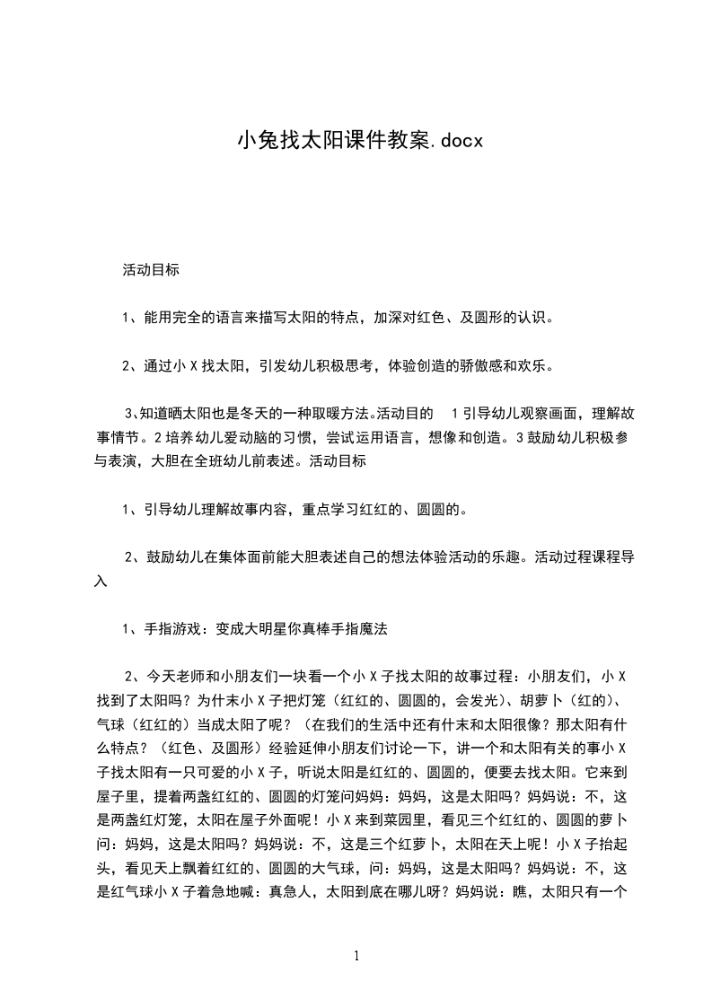 1、完整讲述小兔子找太阳,让幼儿知道小兔子找到太阳了,小兔子说:“太阳是红红的,圆圆的,亮亮的,照在身上暖洋洋的。”师:小兔子有没有找到太阳?它说太阳是什么样子的?