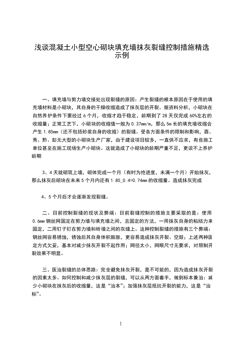 三、医治裂缝的总体思路:完全避免抹灰开裂,是不可能的,因为造成抹灰开裂的因素太多。如何控制和减少抹灰层的裂缝,可以从两方面着手,做到标本兼治:减少小砌块在抹灰后的收缩量,这是“治本”;加强抹灰层抵抗开裂的能力,这是“治标”。