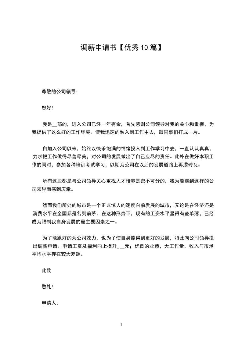 我相信,只要有付出,就会有收获,由我目前的薪酬是--_元,我认为已经不能和我目前的工作付出成正比。随着 ---- 战略体系建设的不断推进,我申请公司在充分考虑的情况下给我加薪,以资鼓励和肯定。就我目前的工作性质、工作表现、工作强度、工作要求而言,我期望能加到--_元/月以上,望公司领导给予酌情考虑。