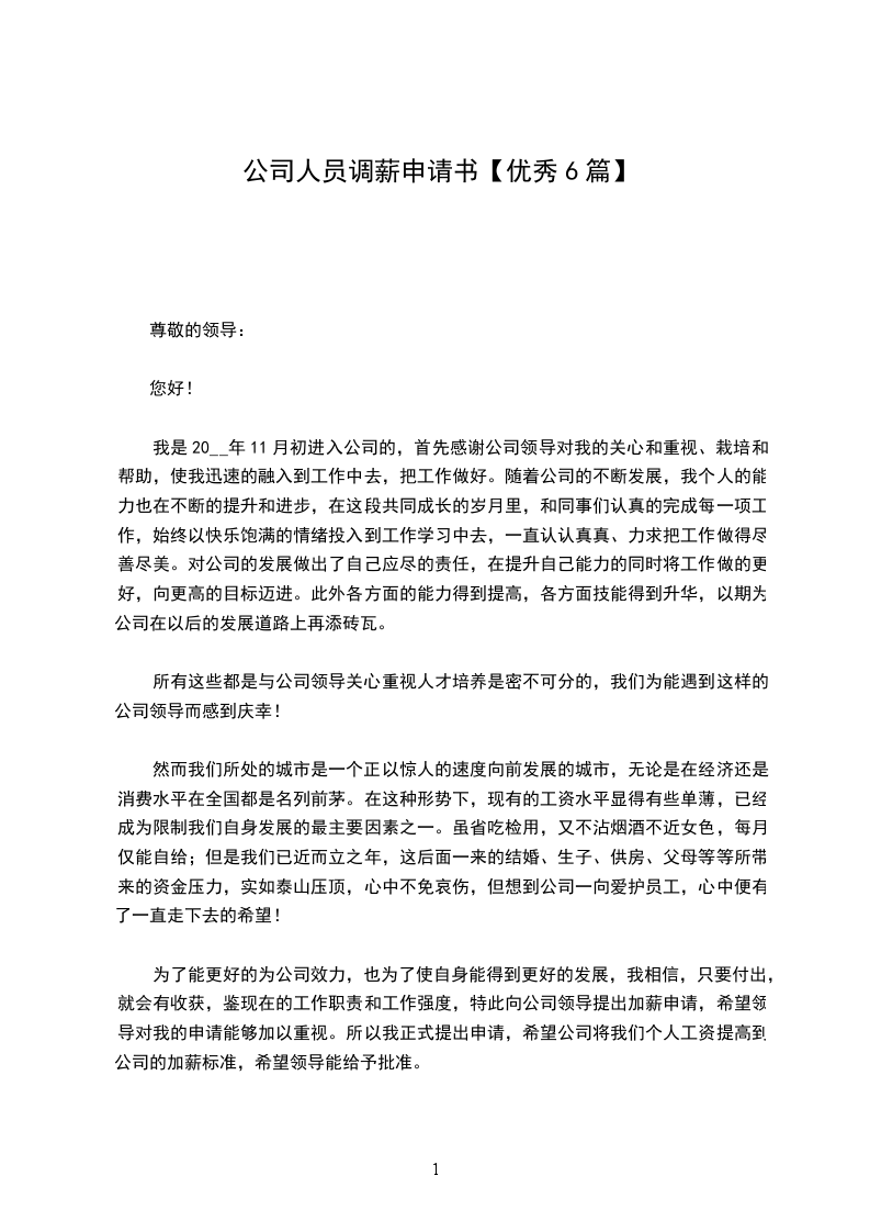 我从20__年至今已经在天津分公司工作了8年,随着公司的不断发展,我个人的能力和业务水平也在不断的提高和提高。经慎重考虑,现申请调整工资。