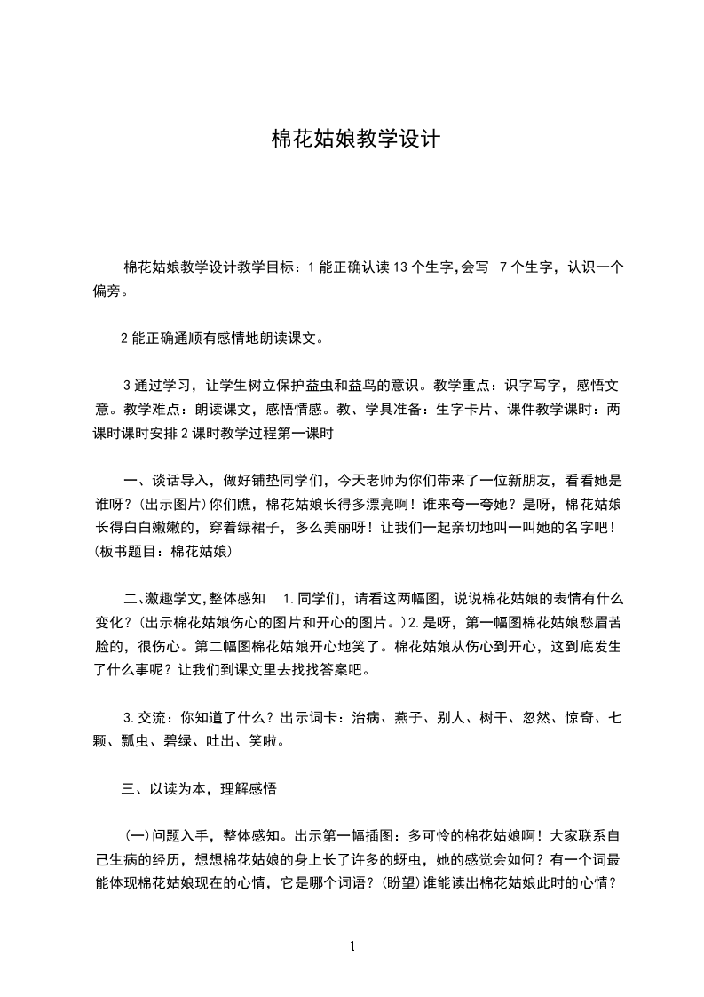 二、激趣学文,整体感知1.同学们,请看这两幅图,说说棉花姑娘的表情有什么变化?(出示棉花姑娘伤心的图片和开心的图片。)2.是呀,第一幅图棉花姑娘愁眉苦脸的,很伤心。第二幅图棉花姑娘开心地笑了。棉花姑娘从伤心到开心,这到底发生了什么事呢?让我们到课文里去找找答案吧。