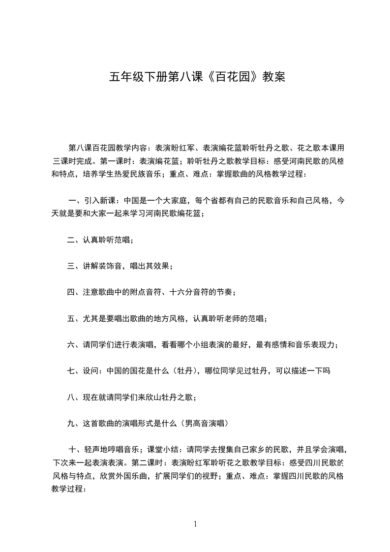 第八课百花园教学内容:表演盼红军、表演编花篮聆听牡丹之歌、花之歌本课用三课时完成。第一课时:表演编花篮;聆听牡丹之歌教学目标:感受河南民歌的风格和特点,培养学生热爱民族音乐;重点、难点:掌握歌曲的风格教学过程: