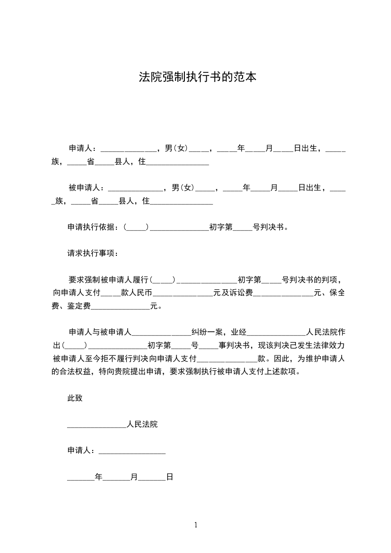 要求强制被申请人履行(_____)_______________初字第_____号判决书的判项,向申请人支付_____款人民币_______________元及诉讼费_______________元、保全费、鉴定费_______________元。