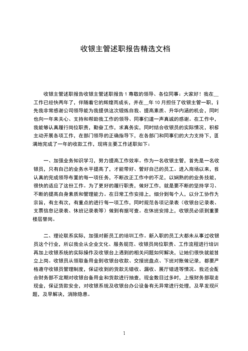 收银主管述职报告收银主管述职报告1尊敬的领导、各位同事:大家好!我在__工作已经快两年了,伴随着它的辉煌而成长,并在__年10月担任了收银主管一职,首先我非常感谢公司领导能为我提供这次锻炼自我、提高素质、升华内涵的机会,同时也向一年来关心、支持和帮助我工作的领导、同事们道一声真诚的感谢。在工作中,我能够认真履行岗位职责,勤奋工作,求真务实,同时结合收银员的实际情况,积极主动开展各项工作,在部门领导的正确指导下,在各部门和同事们的大力支持下,圆满地完成了一年的收款工作,现将主要工作述职如下: