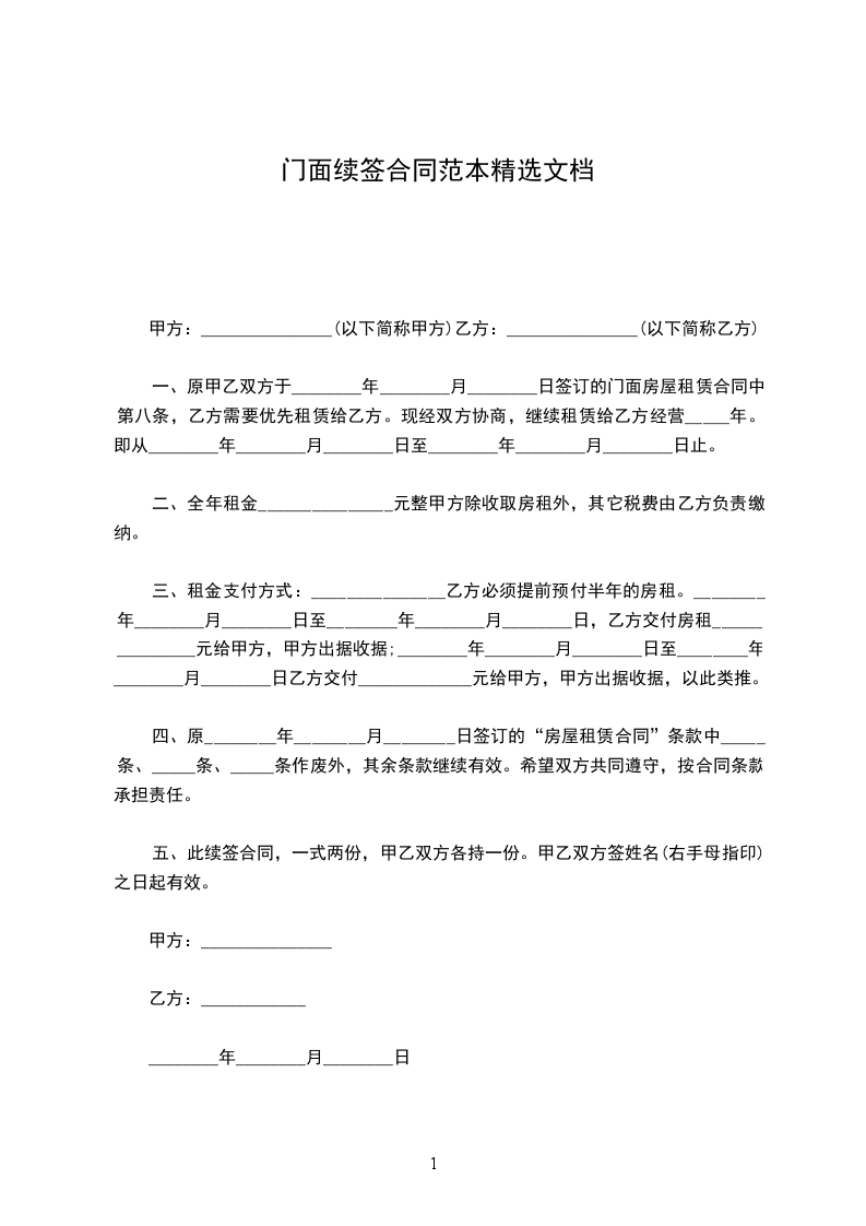 一、原甲乙双方于________年________月________日签订的门面房屋租赁合同中第八条,乙方需要优先租赁给乙方。现经双方协商,继续租赁给乙方经营_____年。即从________年________月________日至________年________月________日止。