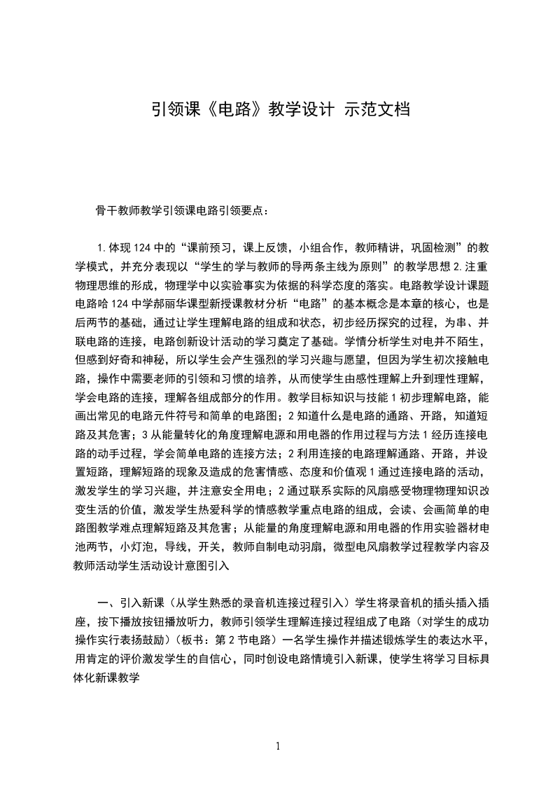 1.体现124中的“课前预习,课上反馈,小组合作,教师精讲,巩固检测”的教学模式,并充分表现以“学生的学与教师的导两条主线为原则”的教学思想2.注重物理思维的形成,物理学中以实验事实为依据的科学态度的落实。电路教学设计课题电路哈124中学郝丽华课型新授课教材分析“电路”的基本概念是本章的核心,也是后两节的基础,通过让学生理解电路的组成和状态,初步经历探究的过程,为串、并联电路的连接,电路创新设计活动的学习奠定了基础。学情分析学生对电并不陌生,但感到好奇和神秘,所以学生会产生强烈的学习兴趣与愿望,但因为学生初次接触电路,操作中需要老师的引领和习惯的培养,从而使学生由感性理解上升到理性理解,学会电路的连接,理解各组成部分的作用。教学目标知识与技能1初步理解电路,能画出常见的电路元件符号和简单的电路图;2知道什么是电路的通路、开路,知道短路及其危害;3从能量转化的角度理解电源和用电器的作用过程与方法1经历连接电路的动手过程,学会简单电路的连接方法;2利用连接的电路理解通路、开路,并设置短路,理解短路的现象及造成的危害情感、态度和价值观1通过连接电路的活动,激发学生的学习兴趣,并注意安全用电;2通过联系实际的风扇感受物理物理知识改变生活的价值,激发学生热爱科学的情感教学重点电路的组成,会读、会画简单的电路图教学难点理解短路及其危害;从能量的角度理解电源和用电器的作用实验器材电池两节,小灯泡,导线,开关,教师自制电动羽扇,微型电风扇教学过程教学内容及教师活动学生活动设计意图引入