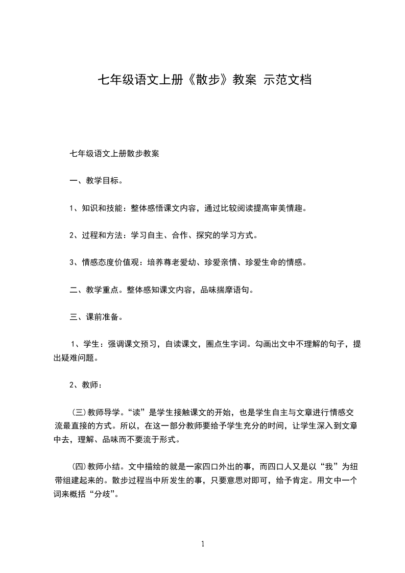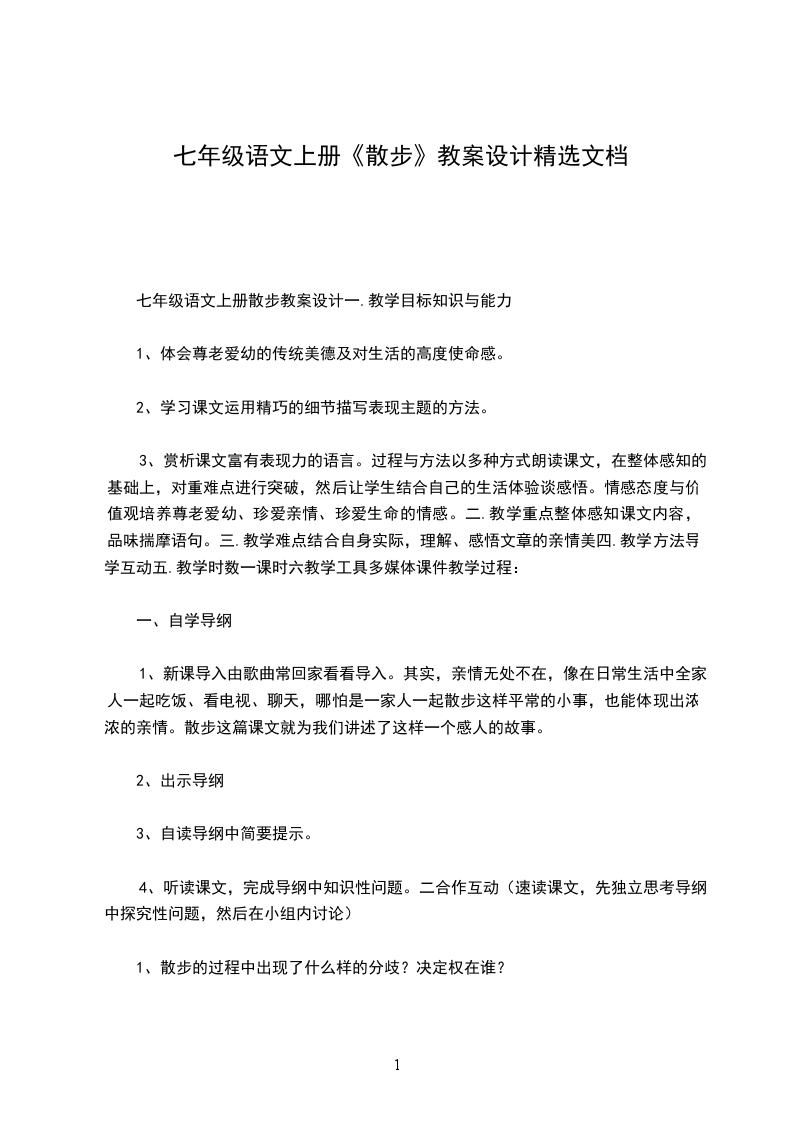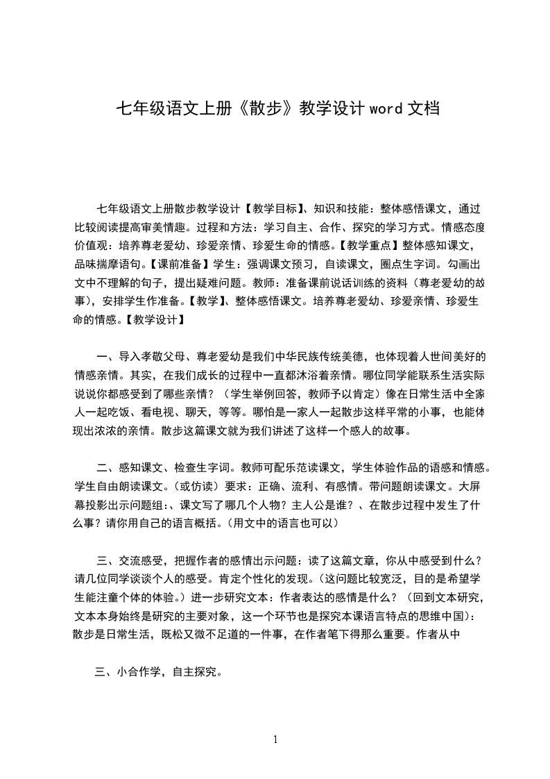 七年级语文散步教学设计导语:散步是七年级上册的一篇叙事性散文,用简单的文字,表达了美好的亲情。【学习目标】1.学习运用精巧的细节描写表现主题的方法,体会人物形象美。