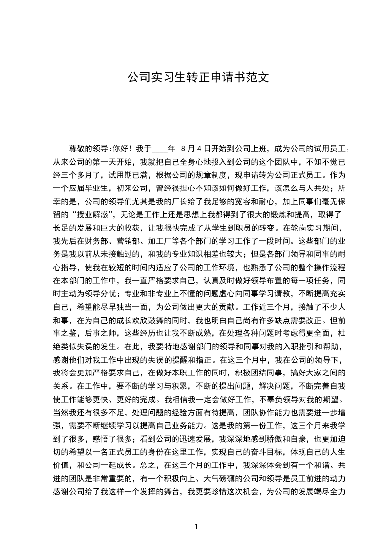 尊敬的领导:你好!我于____年8月4日开始到公司上班,成为公司的试用员工。从来公司的第一天开始,我就把自己全身心地投入到公司的这个团队中,不知不觉已经三个多月了,试用期已满,根据公司的规章制度,现申请转为公司正式员工。作为一个应届毕业生,初来公司,曾经很担心不知该如何做好工作,该怎么与人共处;所幸的是,公司的领导们尤其是我的厂长给了我足够的宽容和耐心,加上同事们毫无保留的“授业解惑”,无论是工作上还是思想上我都得到了很大的锻炼和提高,取得了长足的发展和巨大的收获,让我很快完成了从学生到职员的转变。在轮岗实习期间,我先后在财务部、营销部、加工厂等各个部门的学习工作了一段时间。这些部门的业务是我以前从未接触过的,和我的专业知识相差也较大;但是各部门领导和同事的耐心指导,使我在较短的时间内适应了公司的工作环境,也熟悉了公司的整个操作流程。在本部门的工作中,我一直严格要求自己,认真及时做好领导布置的每一项任务,同时主动为领导分忧;专业和非专业上不懂的问题虚心向同事学习请教,不断提高充实自己,希望能尽早独当一面,为公司做出更大的贡献。工作近三个月,接触了不少人和事,在为自己的成长欢欣鼓舞的同时,我也明白自己尚有许多缺点需要改正。但前事之鉴,后事之师,这些经历也让我不断成熟,在处理各种问题时考虑得更全面,杜绝类似失误的发生。在此,我要特地感谢部门的领导和同事对我的入职指引和帮助,感谢他们对我工作中出现的失误的提醒和指正。在这三个月中,我在公司的领导下,我将会更加严格要求自己,在做好本职工作的同时,积极团结同事,搞好大家之间的关系。在工作中,要不断的学习与积累,不断的提出问题,解决问题,不断完善自我,使工作能够更快、更好的完成。我相信我一定会做好工作,不辜负领导对我的期望。当然我还有很多不足,处理问题的经验方面有待提高,团队协作能力也需要进一步增强,需要不断继续学习以提高自己业务能力。这是我的第一份工作,这三个月来我学到了很多,感悟了很多;看到公司的迅速发展,我深深地感到骄傲和自豪,也更加迫切的希望以一名正式员工的身份在这里工作,实现自己的奋斗目标,体现自己的人生价值,和公司一起成长。总之,在这三个月的工作中,我深深体会到有一个和谐、共进的团队是非常重要的,有一个积极向上、大气磅礴的公司和领导是员工前进的动力。感谢公司给了我这样一个发挥的舞台,我更要珍惜这次机会,为公司的发展竭尽全力。在此我提出转正申请,恳请领导给我继续锻炼自己、实现理想的机会。作为一个初入职场的新人,我将会继续以谦虚的态度和饱满的热情做好我的本职工作,不断提高自己的业务水平,增长自己的知识体系,争取在今后的工作中发挥更大的作用,为公司的发展建设添砖加瓦,同公司一起展望美好的未来!转正申请人:20__年11月23日