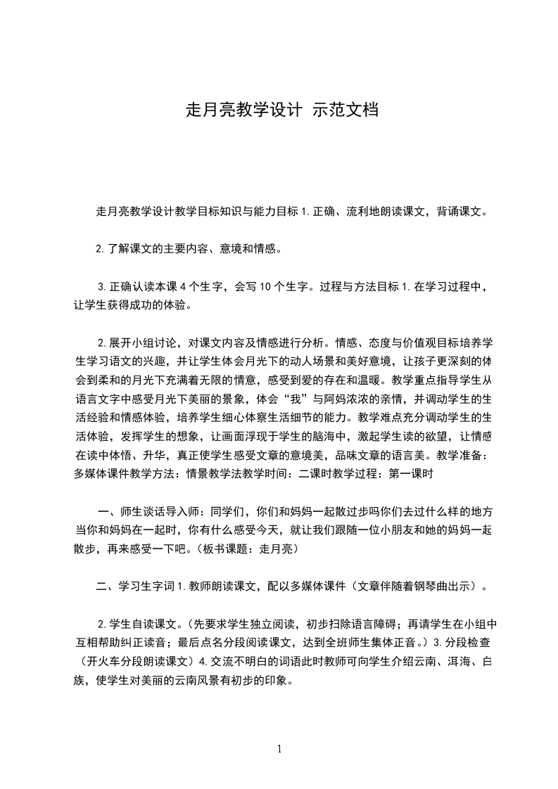 一、师生谈话导入师:同学们,你们和妈妈一起散过步吗你们去过什么样的地方当你和妈妈在一起时,你有什么感受今天,就让我们跟随一位小朋友和她的妈妈一起散步,再来感受一下吧。(板书课题:走月亮)