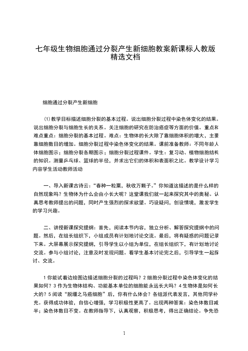 (1)教学目标描述细胞分裂的基本过程。说出细胞分裂过程中染色体变化的结果。说出细胞分裂与细胞生长的关系。关注细胞的研究在防治癌症等方面的价值。重点和难点重点:细胞分裂的基本过程。难点:生物体的长大除了靠细胞体积的增大,主要靠细胞数目的增加。细胞分裂过程中染色体变化的结果。课前准备教师:不同年龄人体细胞图示;细胞分裂各期图示;细胞分裂过程课件。学生:复习动、植物细胞结构的知识。测量乒乓球、篮球的半径,并求出它们的体积和表面积之比。教学设计学习内容学生活动教师活动