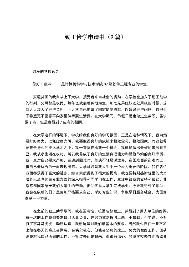 勤工助学申请书篇九