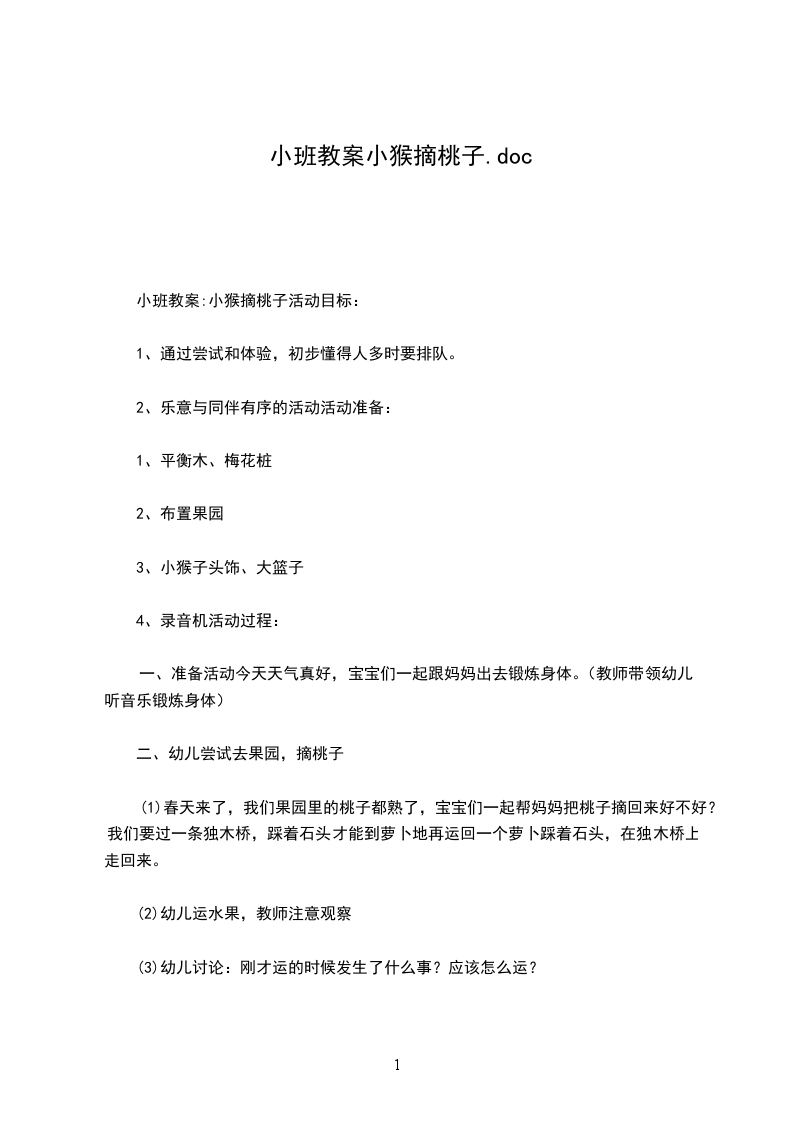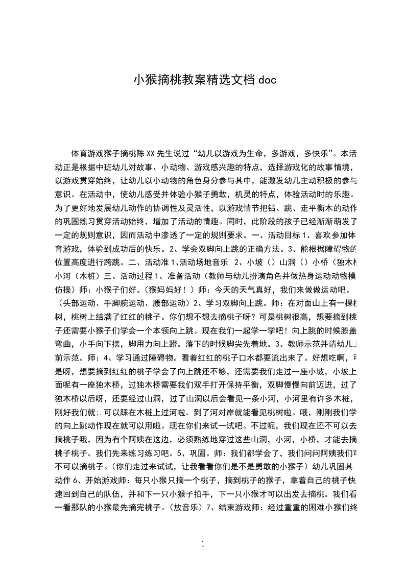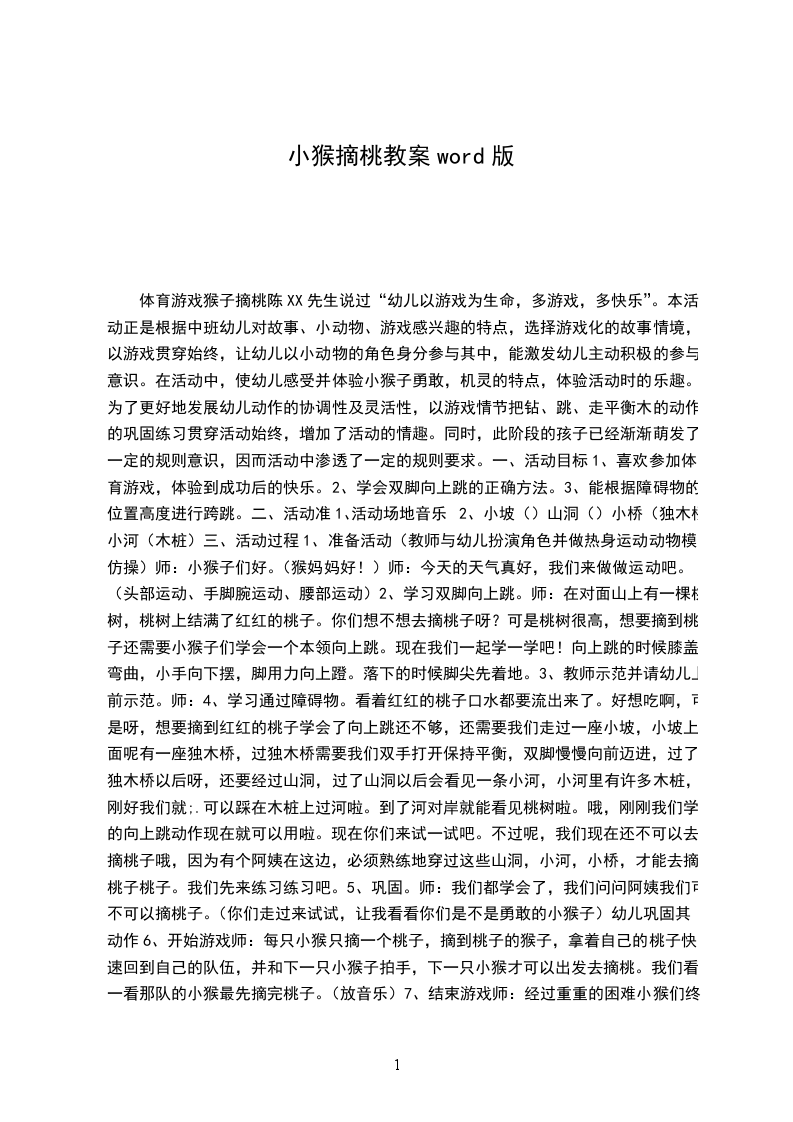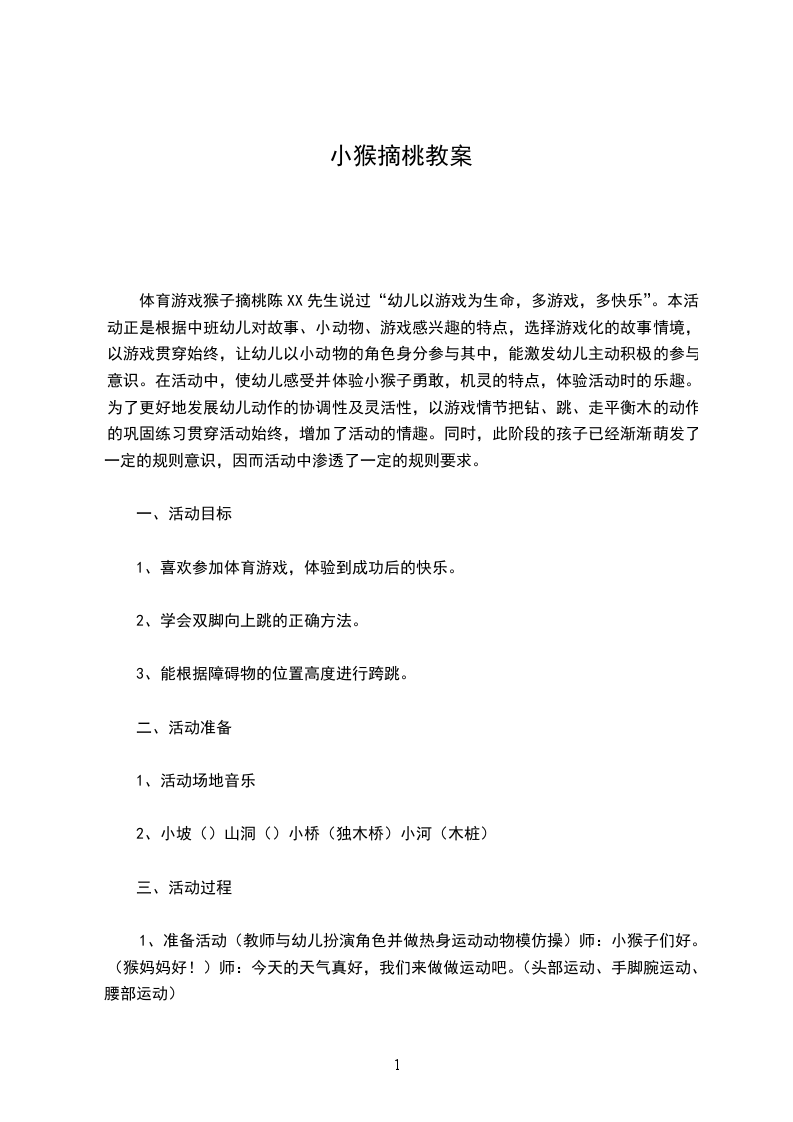 体育游戏猴子摘桃陈XX先生说过“幼儿以游戏为生命,多游戏,多快乐”。本活动正是根据中班幼儿对故事、小动物、游戏感兴趣的特点,选择游戏化的故事情境,以游戏贯穿始终,让幼儿以小动物的角色身分参与其中,能激发幼儿主动积极的参与意识。在活动中,使幼儿感受并体验小猴子勇敢,机灵的特点,体验活动时的乐趣。为了更好地发展幼儿动作的协调性及灵活性,以游戏情节把钻、跳、走平衡木的动作的巩固练习贯穿活动始终,增加了活动的情趣。同时,此阶段的孩子已经渐渐萌发了一定的规则意识,因而活动中渗透了一定的规则要求。