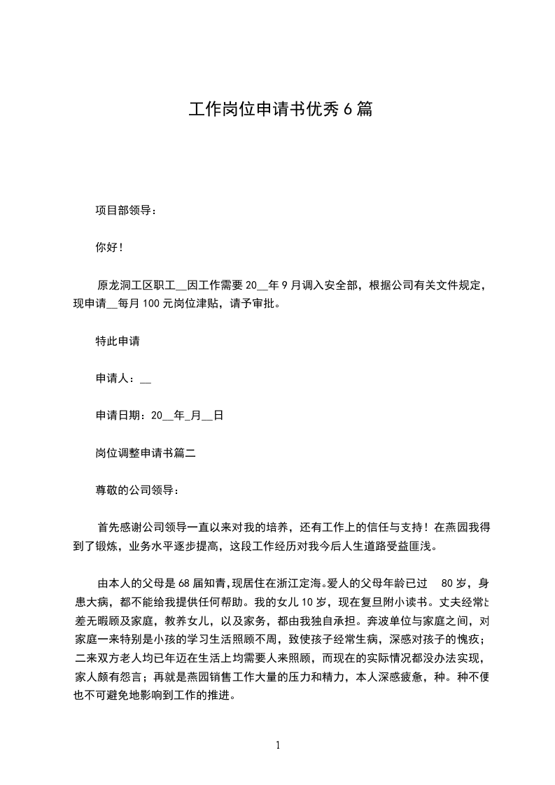 今天,我郑重的向公司提出“___”一职申请。我明白在新的岗位上工作压力会更大,困难会更多。但我已经作好了准备,随时准备迎接新的挑战。不管遇到什么麻烦,我都将和我的团队并肩战斗。我相信自己的能力,因为这一切都来源我对这个工作多年来的热爱,以及全体器材部同事们不懈的支持。在此恳请公司领导给我这个锻炼的机会,我会用谦虚的态度和饱满的热情做好我的每一项工作。为公司创造价值,同公司一起展望美好的未来!尊敬的公司领导: