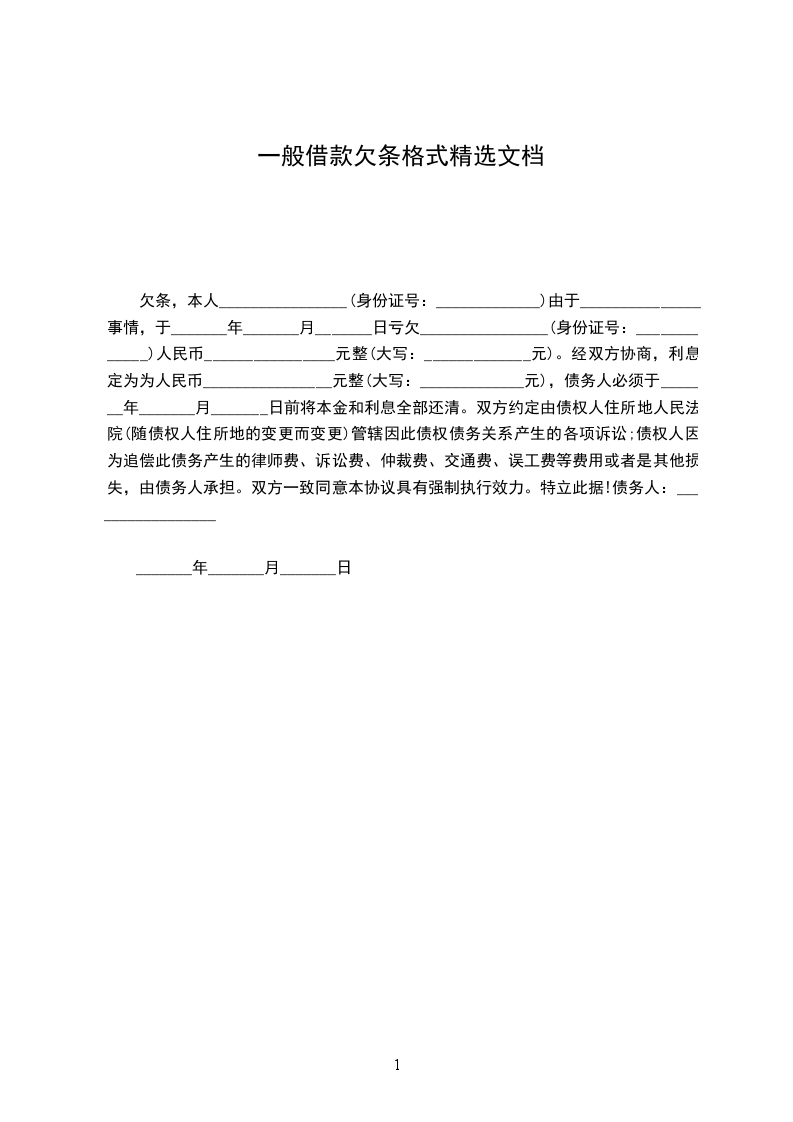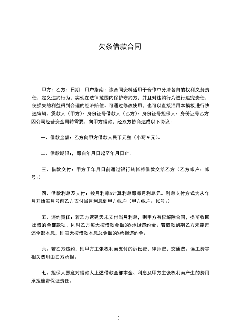 兹因_____________近来手头不便,而向_____________借金额,共得款项人民币_______________元整。预计在__________年__________月__________日前如期归还。期间每个月利息人民币_______________元整,需於每个月初支付不得有误。以上唯恐口说无凭,特立此借条为证。
