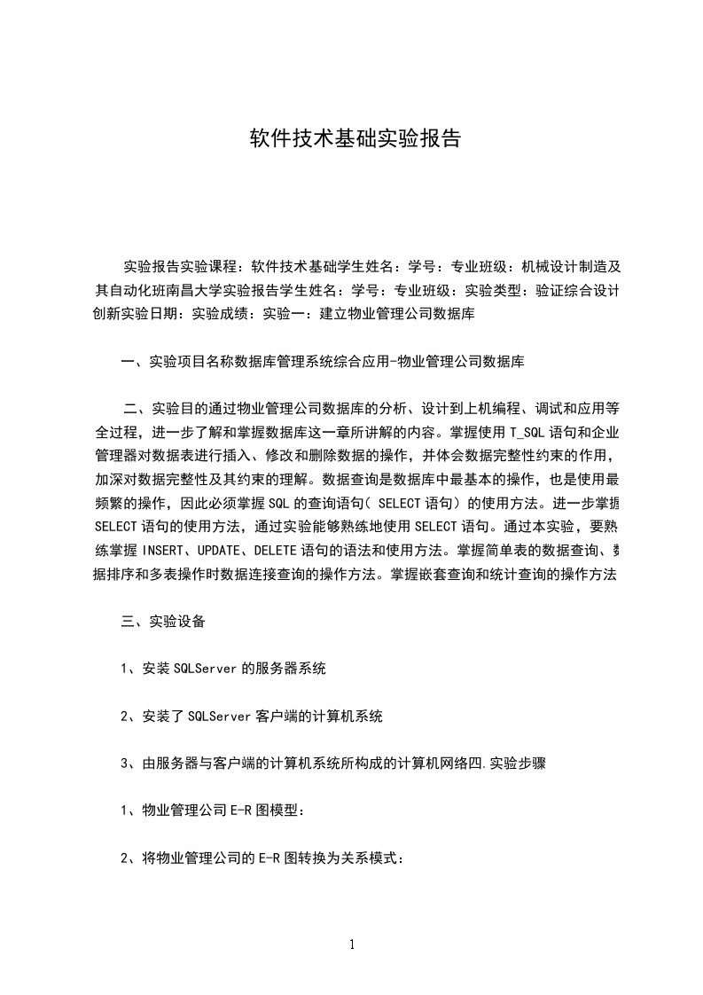 实验报告实验课程:软件技术基础学生姓名:学号:专业班级:机械设计制造及其自动化班南昌大学实验报告学生姓名:学号:专业班级:实验类型:验证综合设计创新实验日期:实验成绩:实验一:建立物业管理公司数据库