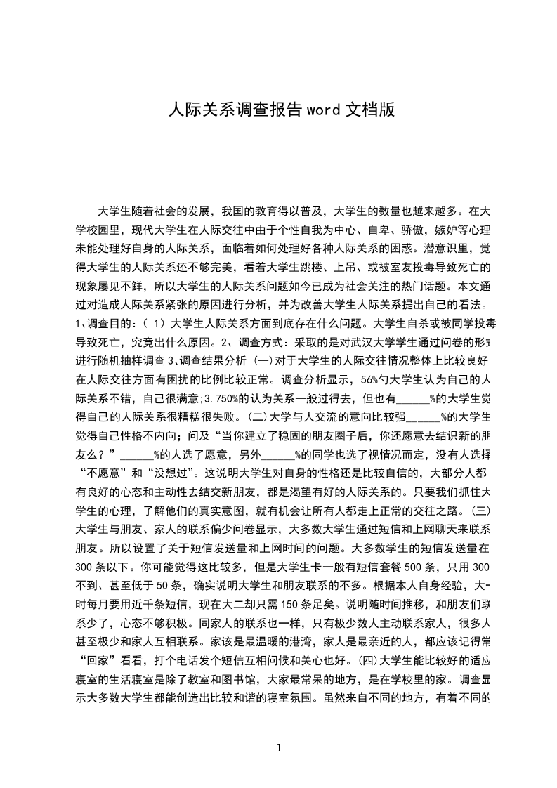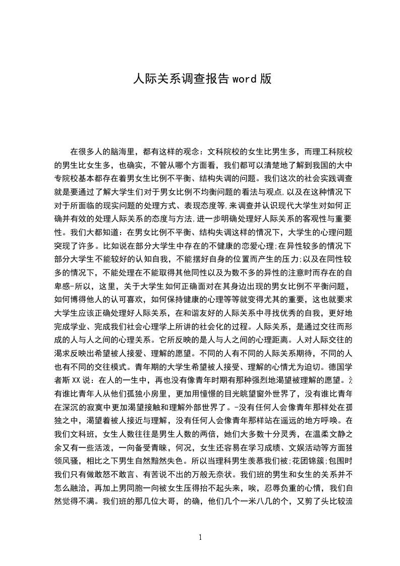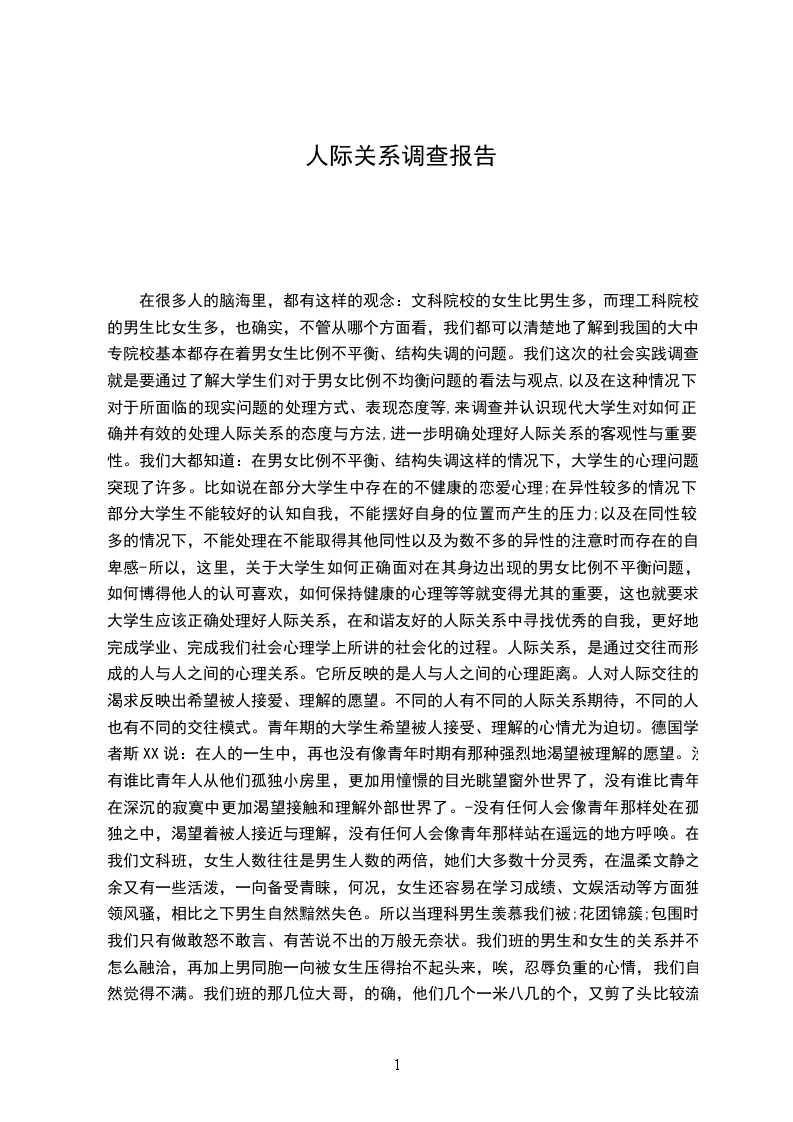 在很多人的脑海里,都有这样的观念:文科院校的女生比男生多,而理工科院校的男生比女生多,也确实,不管从哪个方面看,我们都可以清楚地了解到我国的大中专院校基本都存在着男女生比例不平衡、结构失调的问题。我们这次的社会实践调查就是要通过了解大学生们对于男女比例不均衡问题的看法与观点,以及在这种情况下对于所面临的现实问题的处理方式、表现态度等,来调查并认识现代大学生对如何正确并有效的处理人际关系的态度与方法,进一步明确处理好人际关系的客观性与重要性。我们大都知道:在男女比例不平衡、结构失调这样的情况下,大学生的心理问题突现了许多。比如说在部分大学生中存在的不健康的恋爱心理;在异性较多的情况下部分大学生不能较好的认知自我,不能摆好自身的位置而产生的压力;以及在同性较多的情况下,不能处理在不能取得其他同性以及为数不多的异性的注意时而存在的自卑感-所以,这里,关于大学生如何正确面对在其身边出现的男女比例不平衡问题,如何博得他人的认可喜欢,如何保持健康的心理等等就变得尤其的重要,这也就要求大学生应该正确处理好人际关系,在和谐友好的人际关系中寻找优秀的自我,更好地完成学业、完成我们社会心理学上所讲的社会化的过程。人际关系,是通过交往而形成的人与人之间的心理关系。它所反映的是人与人之间的心理距离。人对人际交往的渴求反映出希望被人接爱、理解的愿望。不同的人有不同的人际关系期待,不同的人也有不同的交往模式。青年期的大学生希望被人接受、理解的心情尤为迫切。德国学者斯XX说:在人的一生中,再也没有像青年时期有那种强烈地渴望被理解的愿望。没有谁比青年人从他们孤独小房里,更加用憧憬的目光眺望窗外世界了,没有谁比青年在深沉的寂寞中更加渴望接触和理解外部世界了。-没有任何人会像青年那样处在孤独之中,渴望着被人接近与理解,没有任何人会像青年那样站在遥远的地方呼唤。在我们文科班,女生人数往往是男生人数的两倍,她们大多数十分灵秀,在温柔文静之余又有一些活泼,一向备受青睐,何况,女生还容易在学习成绩、文娱活动等方面独领风骚,相比之下男生自然黯然失色。所以当理科男生羡慕我们被;花团锦簇;包围时,我们只有做敢怒不敢言、有苦说不出的万般无奈状。我们班的男生和女生的关系并不怎么融洽,再加上男同胞一向被女生压得抬不起头来,唉,忍辱负重的心情,我们自然觉得不满。我们班的那几位大哥,的确,他们几个一米八几的个,又剪了头比较流行的发型,往校园里一站,算得上一道风景,也许就是因为这样,几个家伙被捧的,就差没天上地下了,-,在班上我们女生一般都不会主动和他们讲话,或许你不相信,我到现在还没和我们班的所有的男生都说过话呢,虽然就那么几个男生,呵呵。这是在我们作调查时摘录的一位文科类的男生和一位文科类女生的话。男生的言语看起来似乎在像我们诉苦,而女生则似乎只是平淡地在回答我们的问题,又似乎带有一点的怨。但不管怎样。有一点我们是清楚的:它让我们看到了,在男女生比例失调的班上,一般都存在这样那样的人际交往问题,而一般的同学都不会把处理好人际关系看得很重,他们认为只要自己过好了就没什么问题了。不知他们有没有考虑过,所谓的自己过好也包括自己要拥有和谐的人际关系网,要懂得与他人交流,懂得让他人了解你、信任你、喜欢你。当然,我们可以猜想,这些男生和女生们或许也会有为什么我受不到别人的欢迎、我如何与其他同学更好地沟通、怎样让大家更好得了解我、怎样在这样的一个群体中突现自己、我是不是应该改变一下我的待人处事态度等等一系列的问题。需要提醒的是,不管他们对于人际关系重要性的态度怎样,对于处理人际关系所运用的方法怎样,他们都应该有这样的意识-要多吸收经验、教训,要多学习方法,要多勇敢地与他人交流,要懂得循序渐进,不断进步。有一本书叫做你是最受欢迎的人,它就从心理学的某些观点出发,讲述了如何通过有效的方法把握好人际交往,让自己成为最受欢迎的人。或许我们可以从中找出大学生在校园中更完美得处理好人际关系的方法。在平时的学习、生活中,我们大学生都应该时刻注意讲什么话才能更吸引人,不能故意拿自己或别人开玩笑,对陌生人要不吝啬赞美等;应该懂得怎样拒绝人最不会得罪人、怎样说话最能避免难堪、怎样说话最能取得别人的谅解、怎样说话最有利于沟通并且正确区别对待别人对你的嘲讽;在自己能力范围内要尽量为他人帮忙;遇事不能过于冲动,要合理解决,尽量防止与他人产生冲突;能懂得正确的处理与他人的矛盾,充分重视关系网的维护;当然,也应该善于成人之美、注意保持谦逊,摈弃嫉妒心理等等。是不是文科类院校的男生都是宝,理科类院校的女生都是花?、为什么文科的女生倾向与理科的男生,而理科的男生倾向于喜欢文科的女生?这些又是调查中一些同学发表的感慨。理科的男生,稳重,踏实,有一颗包容的心;理工科男生一定很聪明;理工科的男生,会有很强的方向感;理工科的男生对感情专一,不会轻易移情别恋;理工科男生的动手能力很棒-这是一个女生要找理科男生做男朋友的理由。从这里,我们就会了解到男女比例失调带来的不健康恋爱心理已经或多或少