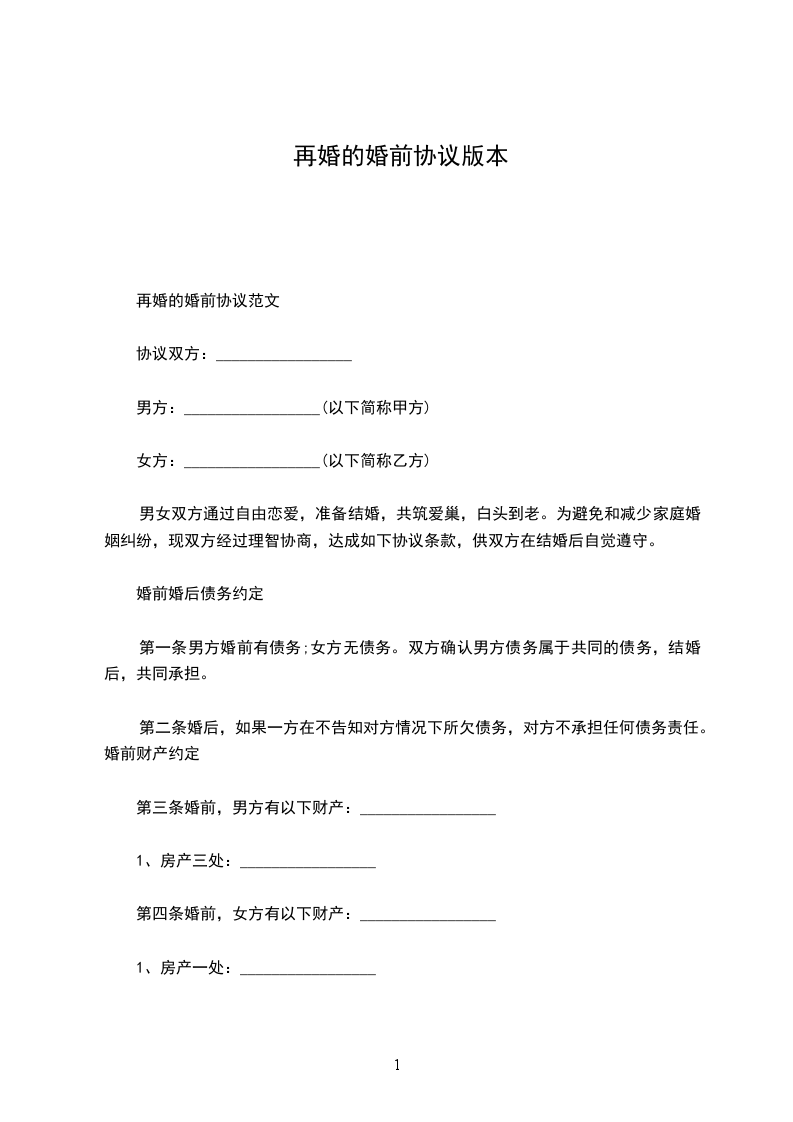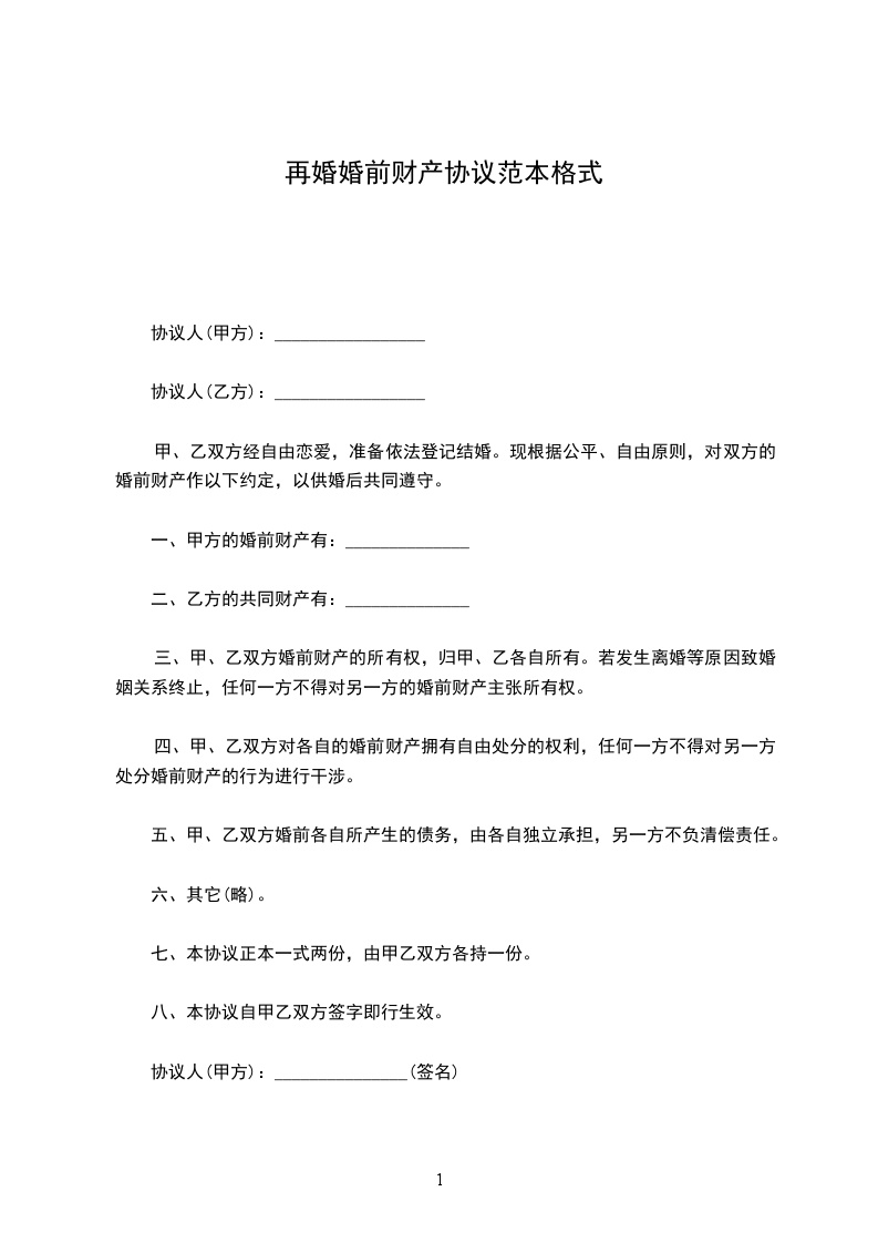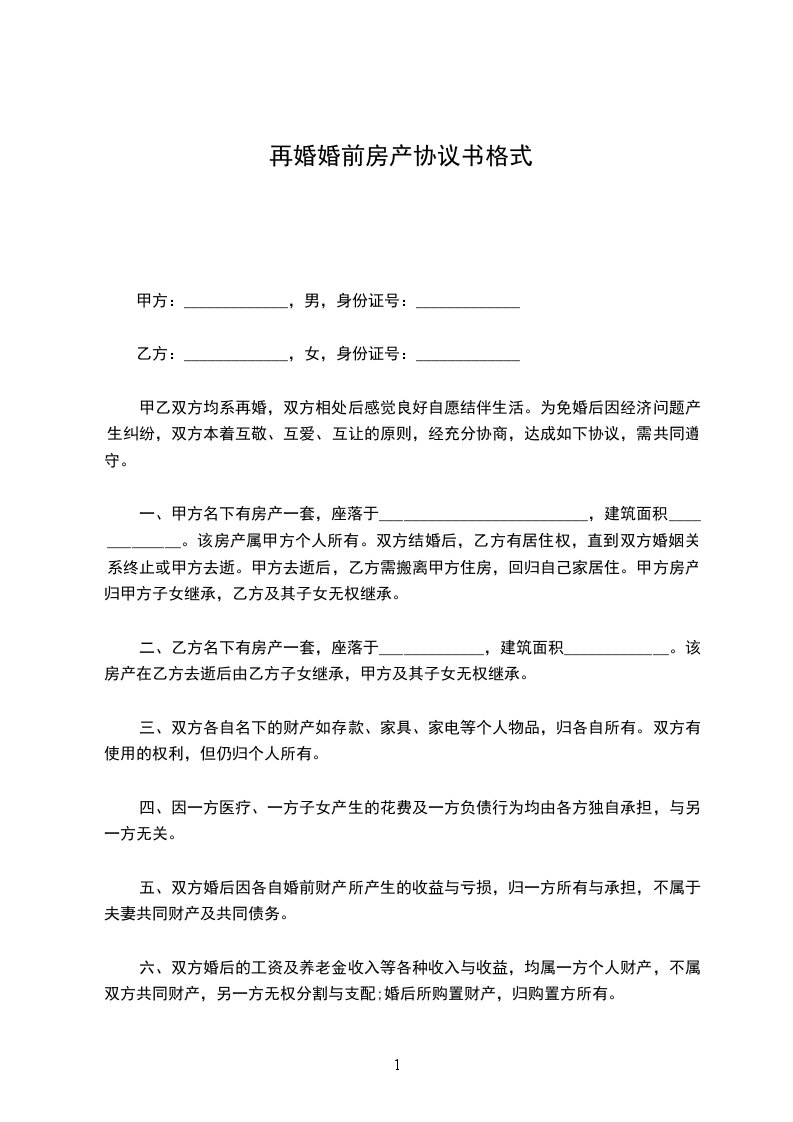 再婚的婚前协议书范本格式