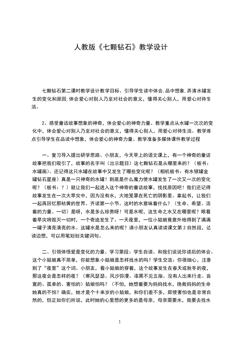 七颗钻石第二课时教学设计教学目标、引导学生读中体会,品中想象,弄清水罐发生的变化和原因,体会爱心对别人乃至对社会的意义,懂得关心别人,用爱心对待生活。