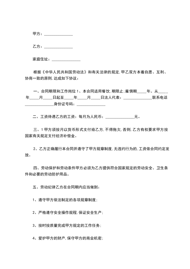 一、合同期限和工作岗位1、本合同适用餐饮,期限止;雇佣期_____年。从_____年_____月_____日起至_____年_____月_____日法人代表:_______________联系电话:_______________身份证号码:_______________