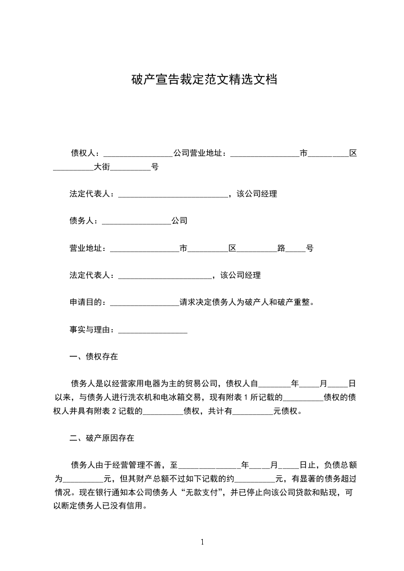 申请目的:_________________请求决定债务人为破产人和破产重整。