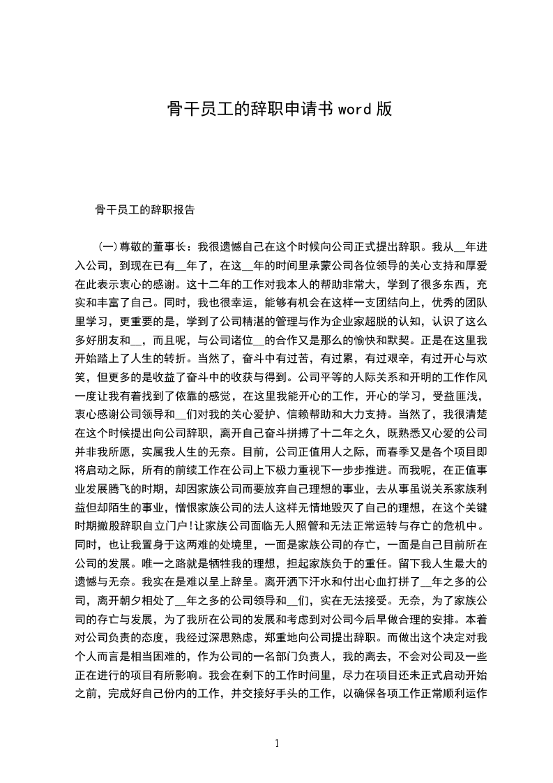 (一)尊敬的董事长:我很遗憾自己在这个时候向公司正式提出辞职。我从__年进入公司,到现在已有__年了,在这__年的时间里承蒙公司各位领导的关心支持和厚爱,在此表示衷心的感谢。这十二年的工作对我本人的帮助非常大,学到了很多东西,充实和丰富了自己。同时,我也很幸运,能够有机会在这样一支团结向上,优秀的团队里学习,更重要的是,学到了公司精湛的管理与作为企业家超脱的认知,认识了这么多好朋友和__,而且呢,与公司诸位__的合作又是那么的愉快和默契。正是在这里我开始踏上了人生的转折。当然了,奋斗中有过苦,有过累,有过艰辛,有过开心与欢笑,但更多的是收益了奋斗中的收获与得到。公司平等的人际关系和开明的工作作风,一度让我有着找到了依靠的感觉,在这里我能开心的工作,开心的学习,受益匪浅,衷心感谢公司领导和__们对我的关心爱护、信赖帮助和大力支持。当然了,我很清楚,在这个时候提出向公司辞职,离开自己奋斗拼搏了十二年之久,既熟悉又心爱的公司,并非我所愿,实属我人生的无奈。目前,公司正值用人之际,而春季又是各个项目即将启动之际,所有的前续工作在公司上下极力重视下一步步推进。而我呢,在正值事业发展腾飞的时期,却因家族公司而要放弃自己理想的事业,去从事虽说关系家族利益但却陌生的事业,憎恨家族公司的法人这样无情地毁灭了自己的理想,在这个关键时期撤股辞职自立门户!让家族公司面临无人照管和无法正常运转与存亡的危机中。同时,也让我置身于这两难的处境里,一面是家族公司的存亡,一面是自己目前所在公司的发展。唯一之路就是牺牲我的理想,担起家族负于的重任。留下我人生最大的遗憾与无奈。我实在是难以呈上辞呈。离开洒下汗水和付出心血打拼了__年之多的公司,离开朝夕相处了__年之多的公司领导和__们,实在无法接受。无奈,为了家族公司的存亡与发展,为了我所在公司的发展和考虑到对公司今后早做合理的安排。本着对公司负责的态度,我经过深思熟虑,郑重地向公司提出辞职。而做出这个决定对我个人而言是相当困难的,作为公司的一名部门负责人,我的离去,不会对公司及一些正在进行的项目有所影响。我会在剩下的工作时间里,尽力在项目还未正式启动开始之前,完成好自己份内的工作,并交接好手头的工作,以确保各项工作正常顺利运作。诚然,遗憾的是在3月份的工作结束后,我将离开这个公司,离开这些曾经同甘共苦的__们,很舍不得。舍不得领导们的譐譐教诲,舍不得__之间的那片真诚和友善。能为公司效力的日子不多了,我会把好自己最后一班岗,做好项目开始前属于自己的所有工作,尽力让项目做到平衡过渡。为了家族公司的发展,现向公司提出辞职,望公司给予批准。最后,祝愿公司在今后的工作中发挥优势,扬长避短,公司的业绩一如既往,一路飙升!兴旺发达!辞职申请人:__年__月__日骨干员工的辞职报告