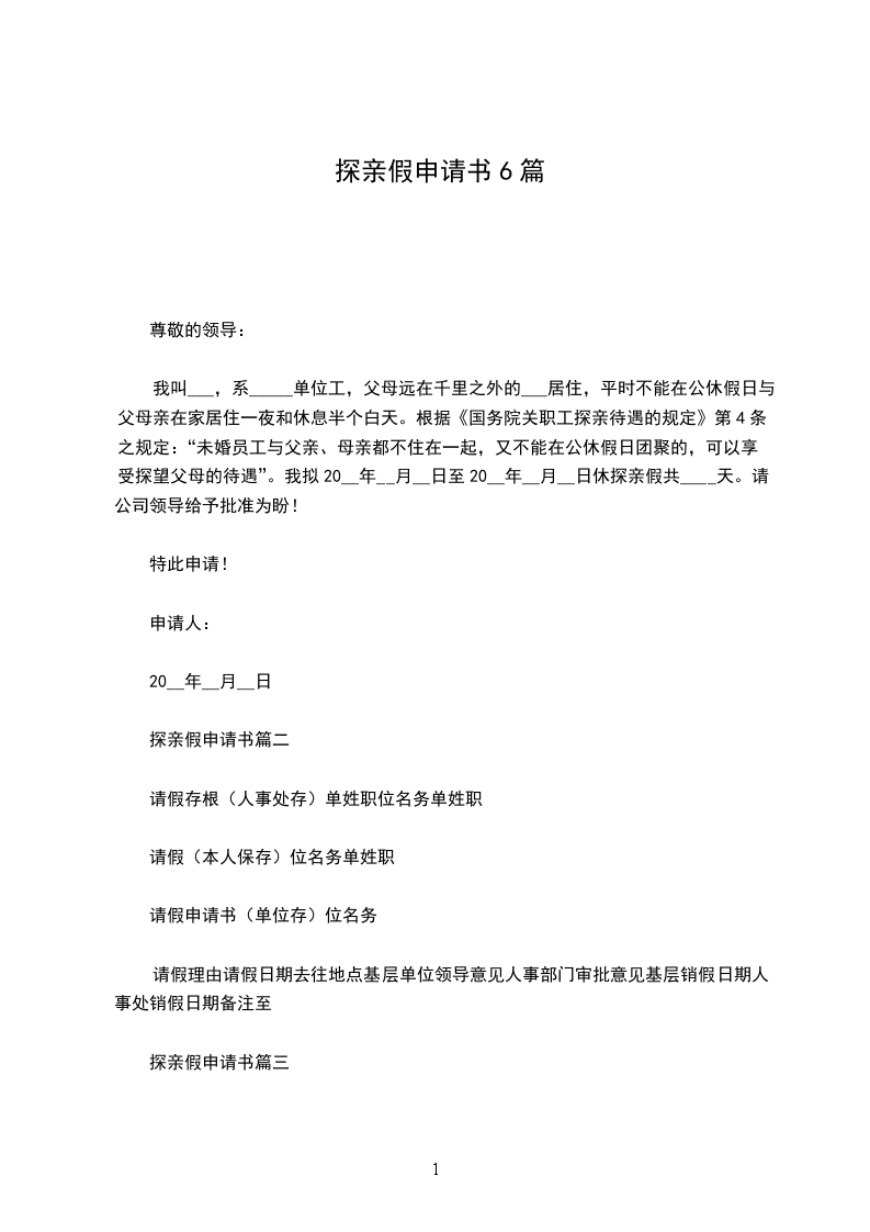 我叫___,系_____单位工,父母远在千里之外的___居住,平时不能在公休假日与父母亲在家居住一夜和休息半个白天。根据《国务院关职工探亲待遇的规定》第4条之规定:“未婚员工与父亲、母亲都不住在一起,又不能在公休假日团聚的,可以享受探望父母的待遇”。我拟20__年__月__日至20__年__月__日休探亲假共____天。请公司领导给予批准为盼!