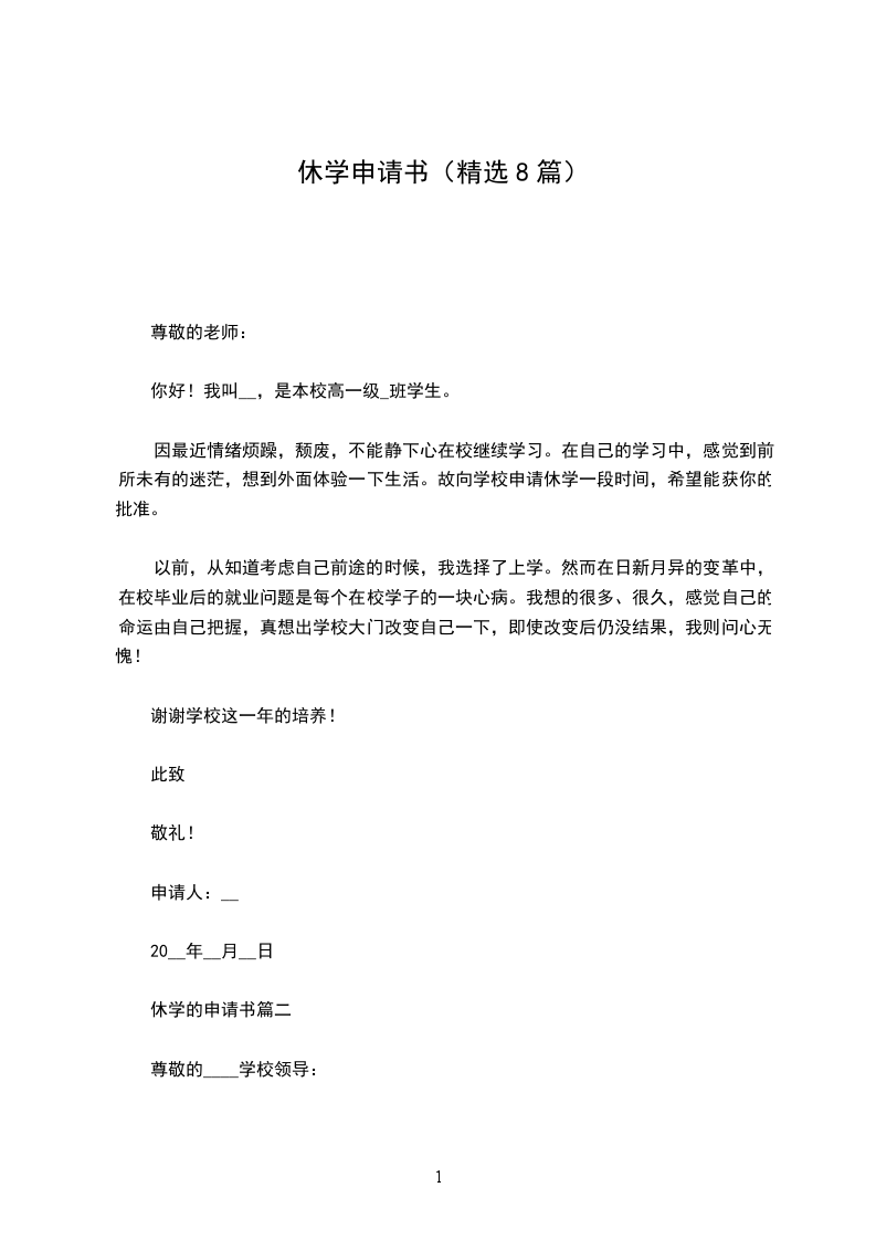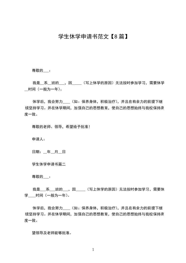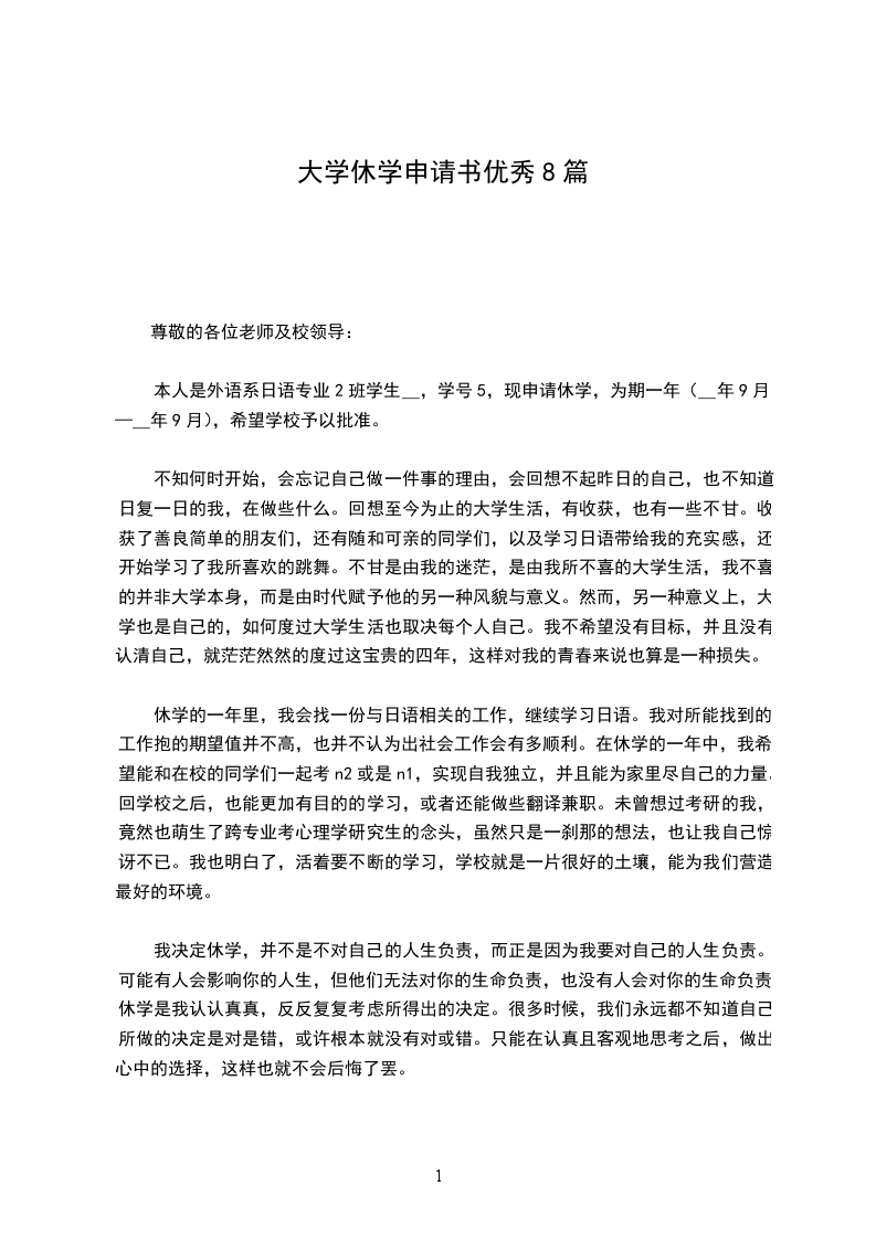 本人是___系___专业__班学生___,现申请休学,为期一年(20__年9月—20__年9月),希望学校予以批准。