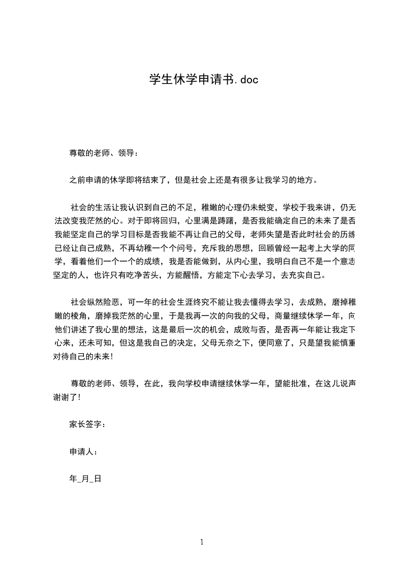 各位老师们我知道你们因我的学习基础差,所以在学校里一直很关注我,但是我还是辜负了你们,但是请你们放心,我决定在休学期间好好休养身心,努力把该补的课程通通补上,并且加强自己的思想教育,使自己的思想始终与我校保持高度一致。;在休学的期间我的人身安全都以我的家人负责,也不会违反法律的规定,不会触碰赌博还有黄色等不健康的东西。在此望领导及老师能够批准。