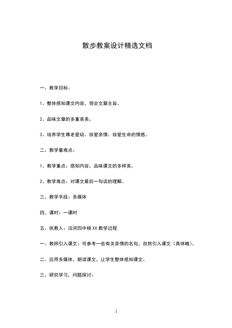 三、深入探究,挖掘“尊老”内涵过渡:这篇课文通过一件平常的不能再平常的小事散步来颂扬了“尊老爱幼”的美德。它如一首动人心弦的诗,一支感人肺腑的歌,深深地叩击着我们的心魄。请大家默读课文,思考:你最喜欢文中的那一个人?理由是什么?大家可以和同位讨论。学生讨论后回答。我先不评判大家的回答,请大家听培根怎么说的,“哺育子女是动物也有的本能,赡养父母才是人类文明之举。”谁能给我们解释一下?总结:“尊老”和“爱幼”都可贵,这既是一个人也是一个国家文明的标志,但我更赞成培根的话,“尊老”更可贵。因为这是人类特有的高尚情感,更是我们中华民族代代相传的珍贵美德“孝”的集中体现。同学们,你们知道“孝”字的最初写法吗?它是一个会意字,上面一个“老”字,下面一个“子”字,古人解释“孝”为“善事父母者”。我希望同学们能深刻理解“尊老”的含义,把中华民族“善事父母”这一美德传承下去!