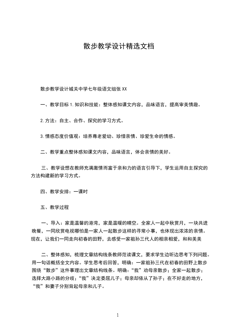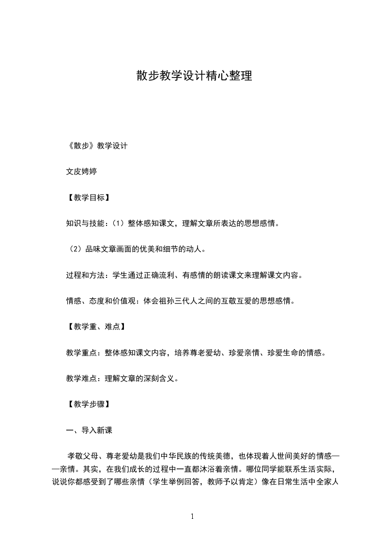二、整体感知,梳理文章结构线条教师范读课文,要求学生边听边思考下列问题。用一句话概括全文内容。学生思考后回答,明确:一家祖孙三代在初春的田野上散步。围绕“散步”这件事理出文章结构线条。明确:“我”劝母亲散步;全家一起散步;选择大路小路的分歧;“我”决定委屈儿子;母亲却依从了孙子;在不好走的地方,“我”和妻子分别背起母亲和儿子。