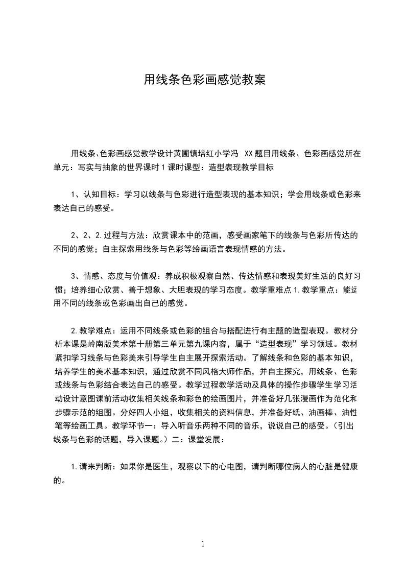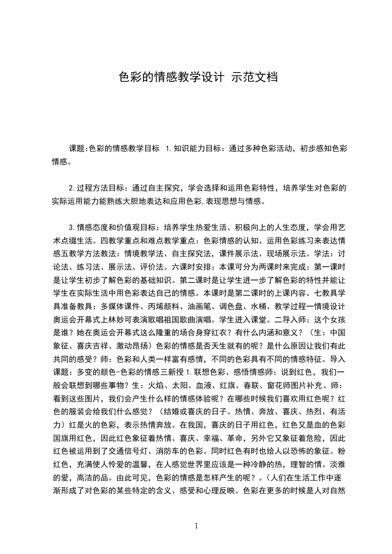 3.情感态度和价值观目标:培养学生热爱生活、积极向上的人生态度,学会用艺术点缀生活。四教学重点和难点教学重点:色彩情感的认知、运用色彩练习来表达情感五教学方法教法:情境教学法、自主探究法,课件展示法、现场展示法。学法:讨论法、练习法、展示法、评价法。六课时安排:本课可分为两课时来完成:第一课时是让学生初步了解色彩的基础知识。第二课时是让学生进一步了解色彩的特性并能让学生在实际生活中用色彩表达自己的情感。本课时是第二课时的上课内容。七教具学具准备教具:多媒体课件、丙烯颜料、油画笔、调色盘、水桶、教学过程一情境设计:奥运会开幕式上林妙可表演歌唱祖国歌曲演唱。学生进入课堂。二导入师:这个女孩是谁?她在奥运会开幕式这么隆重的场合身穿红衣?有什么内涵和意义?(生:中国象征、喜庆吉祥、激动昂扬)色彩的情感是否天生就有的呢?是什么原因让我们有此共同的感受?师:色彩和人类一样富有感情,不同的色彩具有不同的情感特征。导入课题:多变的颜色-色彩的情感三新授1.联想色彩、感悟情感师:说到红色,我们一般会联想到哪些事物?生:火焰、太阳、血液、红旗、春联、窗花师图片补充。师:看到这些图片,我们会产生什么样的情感体验呢?在哪些时候我们喜欢用红色呢?红色的服装会给我们什么感觉?(结婚或喜庆的日子。热情、奔放、喜庆、热烈、有活力)红是火的色彩,表示热情奔放。在我国,喜庆的日子用红色,红色又是血的色彩,国旗用红色,因此红色象征着热情、喜庆、幸福、革命,另外它又象征着危险,因此红色被运用到了交通信号灯、消防车的色彩。同时红色有时也给人以恐怖的象征。粉红色,充满使人怜爱的温馨,在人感觉世界里应该是一种冷静的热,理智的情。淡雅的爱,高洁的品。由此可见,色彩的情感是怎样产生的呢?。(人们在生活工作中逐渐形成了对色彩的某些特定的含义、感受和心理反映。色彩在更多的时候是人对自然和社会的一种观感经验。)2.自主探索、感知色彩情感刚才我们共同探索了红色在生活的应用与其情感的产生之间联系。下面咱们分组进行色彩的情感的探索。每组分配一种色相,进行讨论。要求组长统计出该色彩的联想事物和可能产生的情感特征。两分钟后依次汇报。