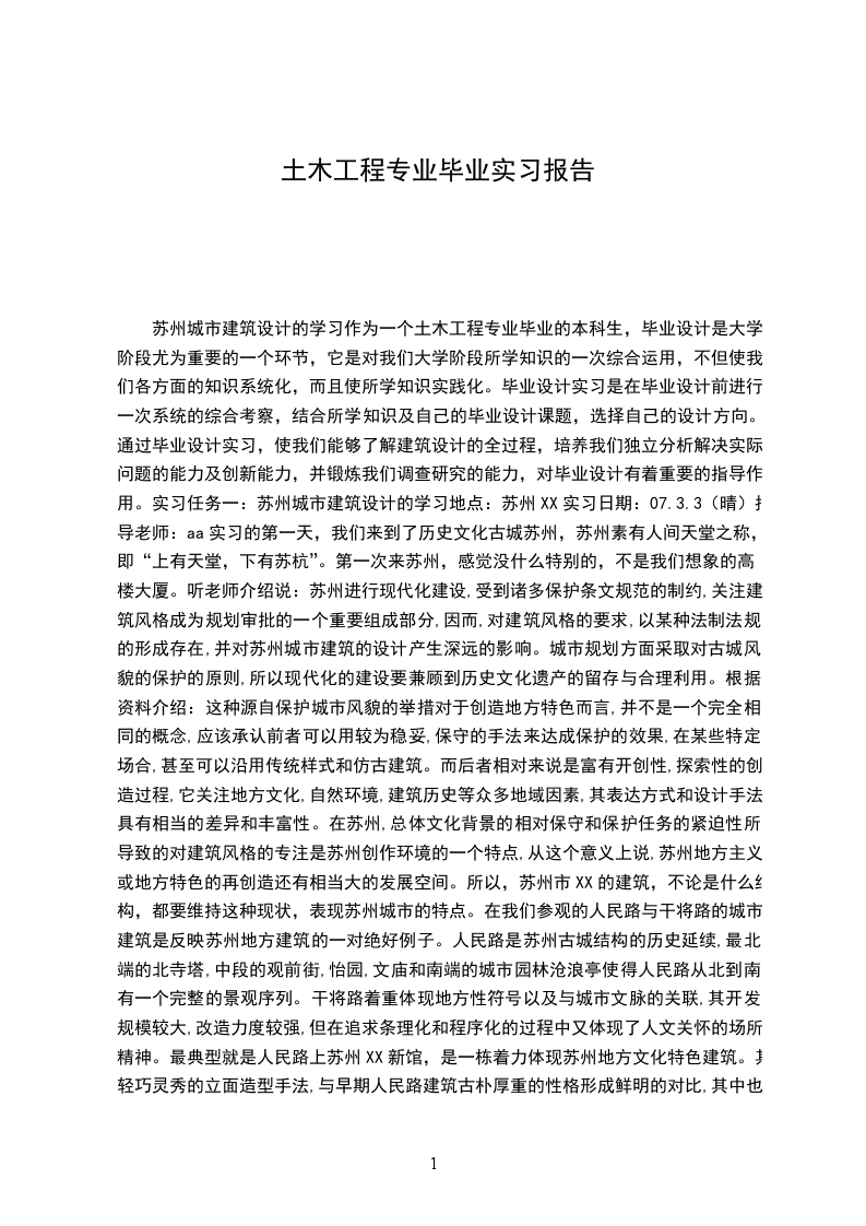 苏州城市建筑设计的学习作为一个土木工程专业毕业的本科生,毕业设计是大学阶段尤为重要的一个环节,它是对我们大学阶段所学知识的一次综合运用,不但使我们各方面的知识系统化,而且使所学知识实践化。毕业设计实习是在毕业设计前进行一次系统的综合考察,结合所学知识及自己的毕业设计课题,选择自己的设计方向。通过毕业设计实习,使我们能够了解建筑设计的全过程,培养我们独立分析解决实际问题的能力及创新能力,并锻炼我们调查研究的能力,对毕业设计有着重要的指导作用。实习任务一:苏州城市建筑设计的学习地点:苏州XX实习日期:07.3.3(晴)指导老师:aa实习的第一天,我们来到了历史文化古城苏州,苏州素有人间天堂之称,即“上有天堂,下有苏杭”。第一次来苏州,感觉没什么特别的,不是我们想象的高楼大厦。听老师介绍说:苏州进行现代化建设,受到诸多保护条文规范的制约,关注建筑风格成为规划审批的一个重要组成部分,因而,对建筑风格的要求,以某种法制法规的形成存在,并对苏州城市建筑的设计产生深远的影响。城市规划方面采取对古城风貌的保护的原则,所以现代化的建设要兼顾到历史文化遗产的留存与合理利用。根据资料介绍:这种源自保护城市风貌的举措对于创造地方特色而言,并不是一个完全相同的概念,应该承认前者可以用较为稳妥,保守的手法来达成保护的效果,在某些特定场合,甚至可以沿用传统样式和仿古建筑。而后者相对来说是富有开创性,探索性的创造过程,它关注地方文化,自然环境,建筑历史等众多地域因素,其表达方式和设计手法具有相当的差异和丰富性。在苏州,总体文化背景的相对保守和保护任务的紧迫性所导致的对建筑风格的专注是苏州创作环境的一个特点,从这个意义上说,苏州地方主义或地方特色的再创造还有相当大的发展空间。所以,苏州市XX的建筑,不论是什么结构,都要维持这种现状,表现苏州城市的特点。在我们参观的人民路与干将路的城市建筑是反映苏州地方建筑的一对绝好例子。人民路是苏州古城结构的历史延续,最北端的北寺塔,中段的观前街,怡园,文庙和南端的城市园林沧浪亭使得人民路从北到南有一个完整的景观序列。干将路着重体现地方性符号以及与城市文脉的关联,其开发规模较大,改造力度较强,但在追求条理化和程序化的过程中又体现了人文关怀的场所精神。最典型就是人民路上苏州XX新馆,是一栋着力体现苏州地方文化特色建筑。其轻巧灵秀的立面造型手法,与早期人民路建筑古朴厚重的性格形成鲜明的对比,其中也隐藏了时代文化上的对比。对地方“风格”的关注在苏州图书馆就集中地表现出来,这种现象和江南其它地区的表现相比更显突出。为什么建筑可以这样随意的按人们的意愿设计成不同的体型?这就和我们结构设计有根本的关系,前面所说的的古代建筑都是砌体结构、木结构,而新建的大多数都是框架,或框剪结构。其中以框架为主,高层中多使用框剪结构。框架结构是梁、柱等杆系构件组成的空间承重体系的结构,是多层、高层建筑的一种主要结构形式。这种结构体系的优点是建筑平面布置灵活,能获得较大的使用空间,建筑立面容易处理,可以适应不同的房屋造型。所以人们可以按照自己的想法设计各式房屋,就像搭积木一样,摆出自己喜欢的造型,都能够用框架来实现,这就是框架结构的优点。所以人民路上的多层建筑,不论是办公楼、商厦、图书馆、行政楼,大都是框架结构,但外形却是苏州古典建筑形象。建筑的形式就被当作了一种信息交流的媒介和模式。为此,便要求建筑形式成为一定含义的符号载体,即意味着使建筑形式符码化。这就是苏州XX的外部立面上众多变形过的构架、纹饰、披檐的意义,从它们的身上公众获取与地域或历史的沟通。苏州XX内部的设计力图还原作为园林主人文人的情趣。由此,我想到了我所设计的中学办公楼,也应像苏州的建筑一样,在建筑设计上争取能被当作一种信息交流的媒介和模式,成为一定含义的符号载体。在结构上采用框架结构,按自己的建筑设计思路合理的的安排空间造型,在建筑造型上努力体现苏北的建筑风格,把建筑物的设计和两汉古典文化结合起来,在现代建筑中融入古代风格,体现徐州的文化风格和韵味。毕业设计实习报告实习任务二:上海建筑建筑设计的学习实习地点:上海陆家嘴实习日期:07.3.4(晴)指导老师:aaaa!第二天,我们来到了上海,第一次体验到了中国第一现代化都市的繁华,鳞次栉比的高楼,繁华的街道,个性多样的建筑,让我们体会到现代建筑业的高速发展,以及人类的智慧。在金贸大厦脚下,让你切实的感觉到什么是伟大和渺小,体会到作为一个土木工程师的责任有多大!金贸大厦是上海市的一座标志性建筑,傲然屹立黄浦XX,人们期待已久的世界第三、中国第一的88层大厦终,这幢集现代办公楼、豪华五星级酒店、商业会展、高档宴会、观光、娱乐、商场等综合设施于一体,深富中华民族文化内涵,溶汇西方建筑艺术的智慧型摩天大楼。根据介绍,金茂大厦于1992年12月17日被批准立项,1994年5月10日动工,1997年8月28日结构封顶,至1999年3月18日开张营业,当年8月28日全面营业。金茂大厦占地2.3公顷,塔楼高420.5米,总建筑面积29万平方米。金茂大厦的设计师是美国芝加哥著名的som设计事务所。设计师以创新的