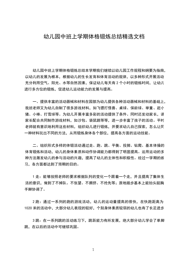 幼儿园中班上学期体格锻炼总结本学期我们继续以幼儿园工作规程和纲要为指南,以幼儿的发展为根本,根据幼儿的生长发育和体育活动的规律,以多种形式开展活动,充分利用空气、阳光、水等自然因素,保证幼儿每天有2个小时的锻炼时间,让幼儿进行多方位的锻炼,促进幼儿运动能力的发展与提高。